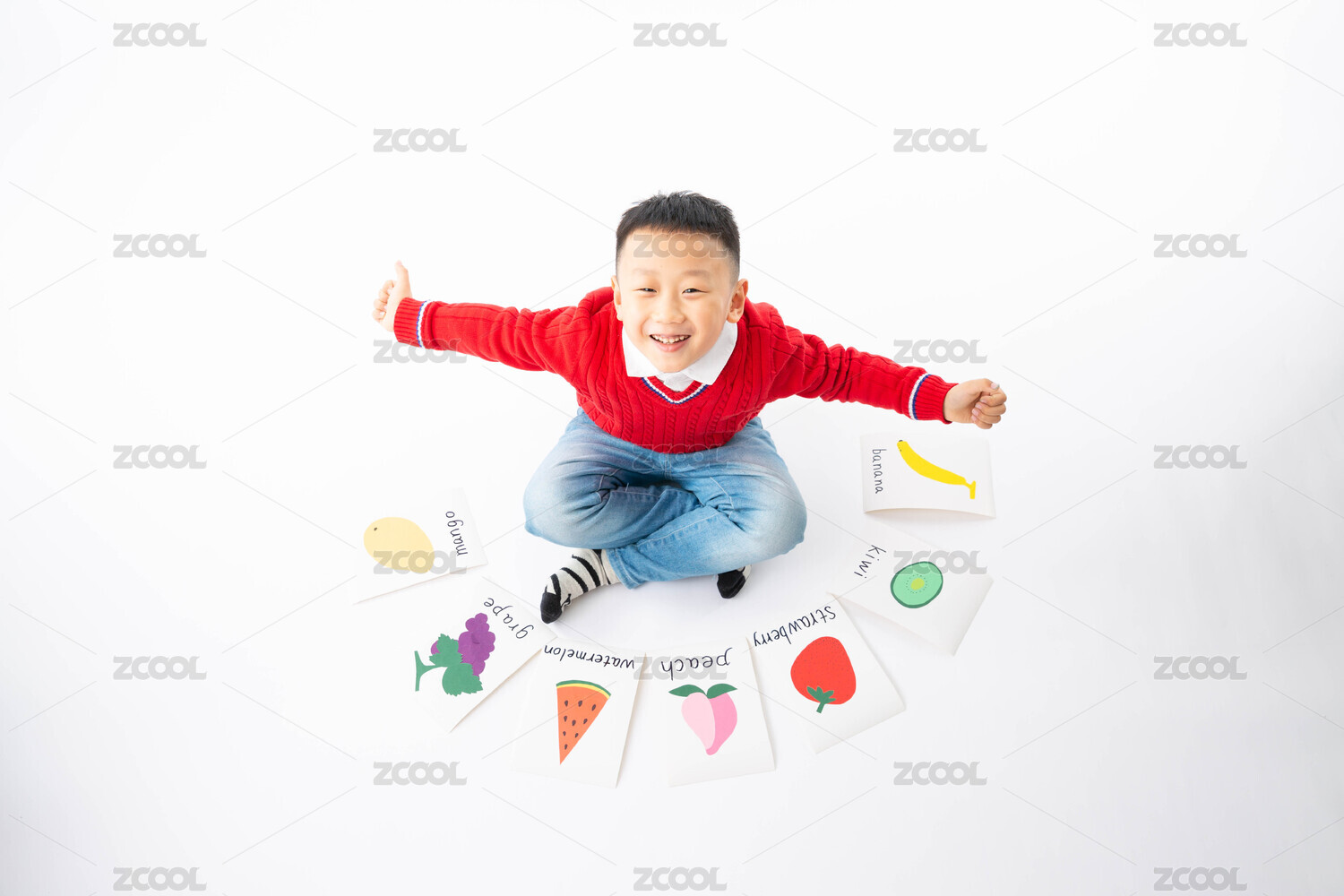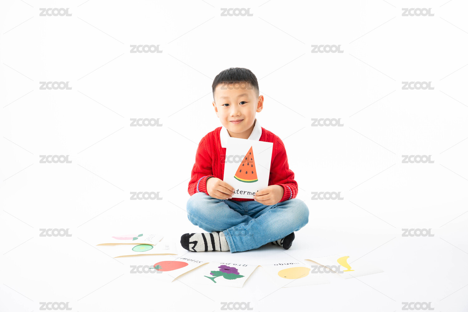 室内白色背景男孩拿着英语卡片学英语