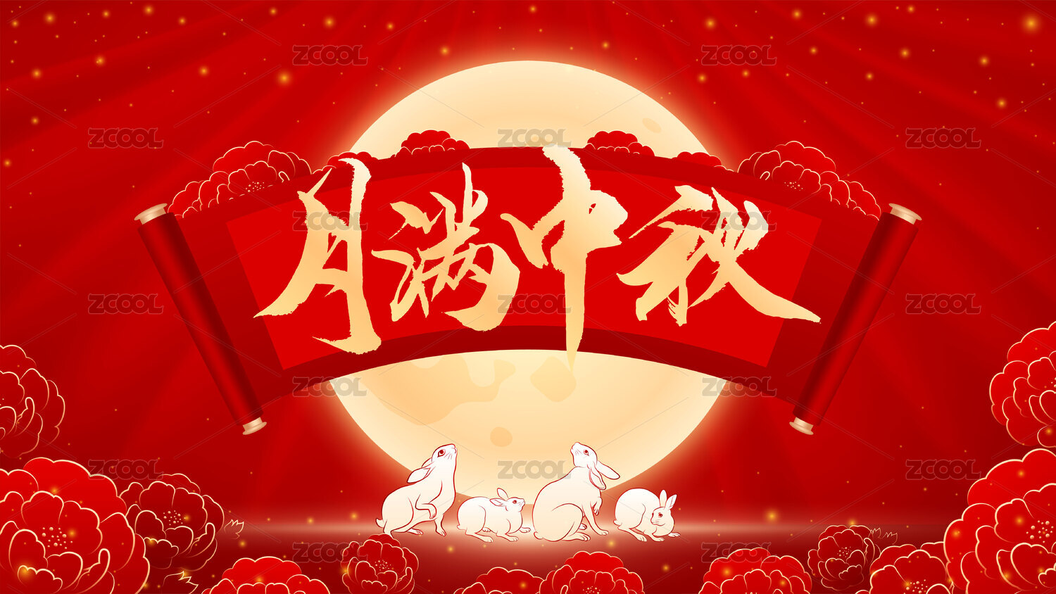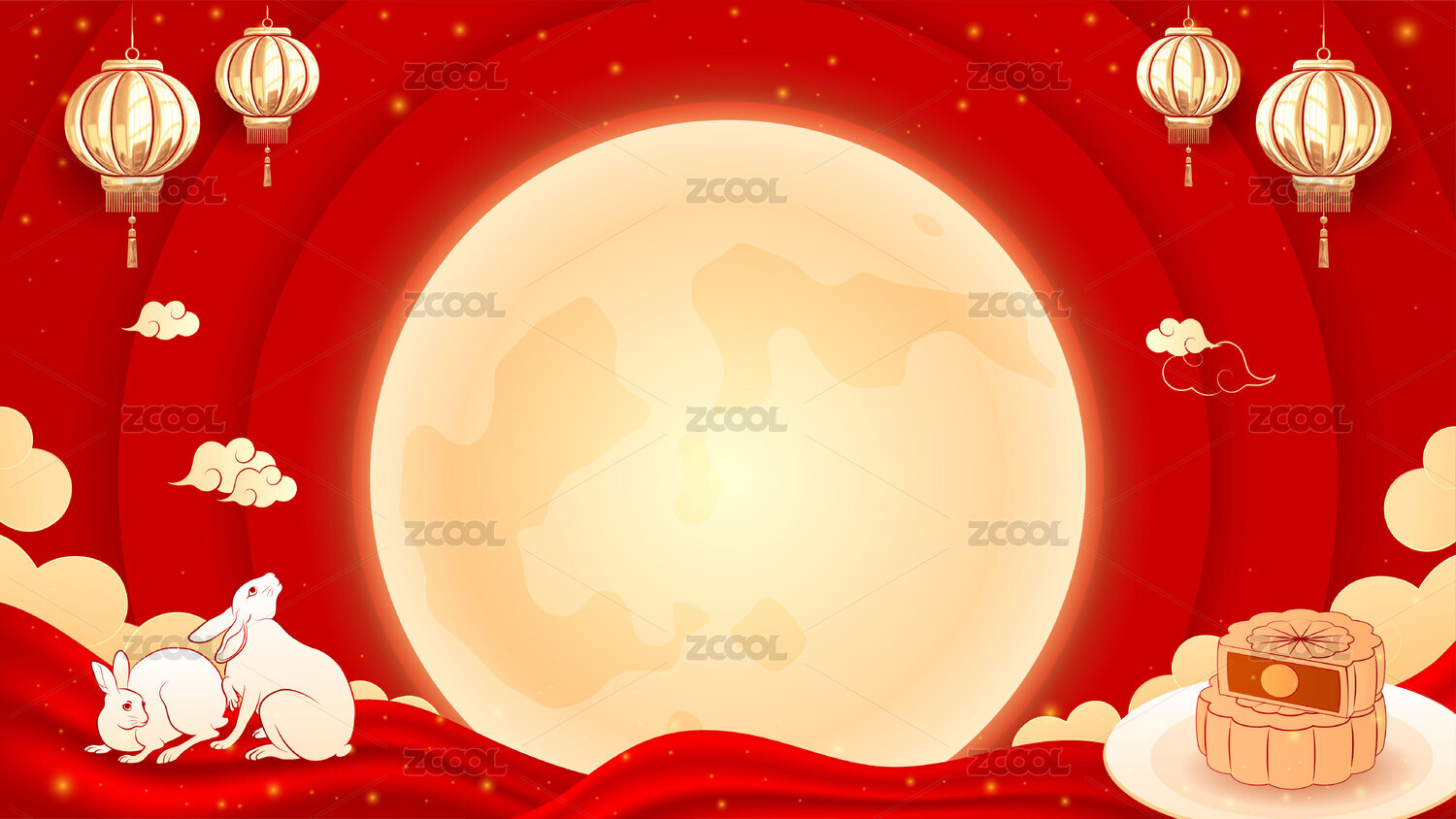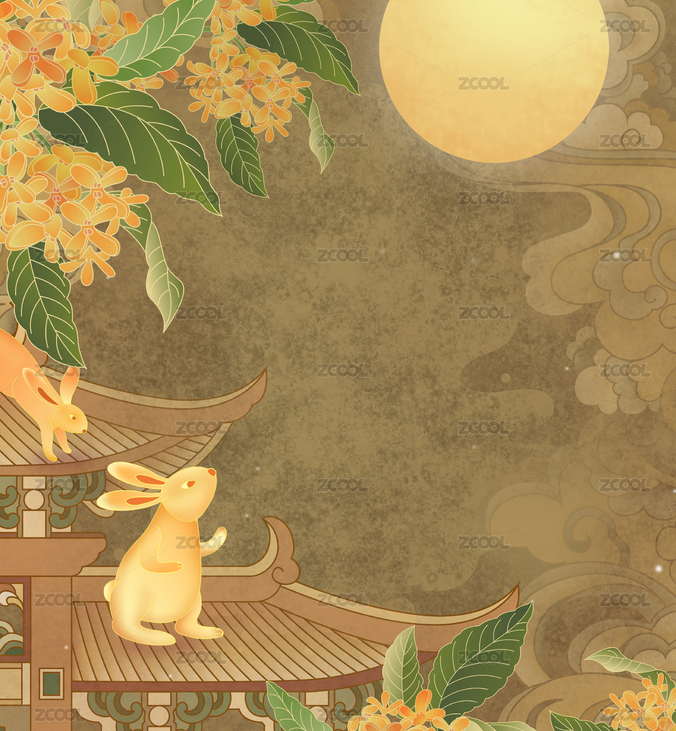 八月十五中秋节满月矢量插画,兔子和祥云符号,山水矢量插画
