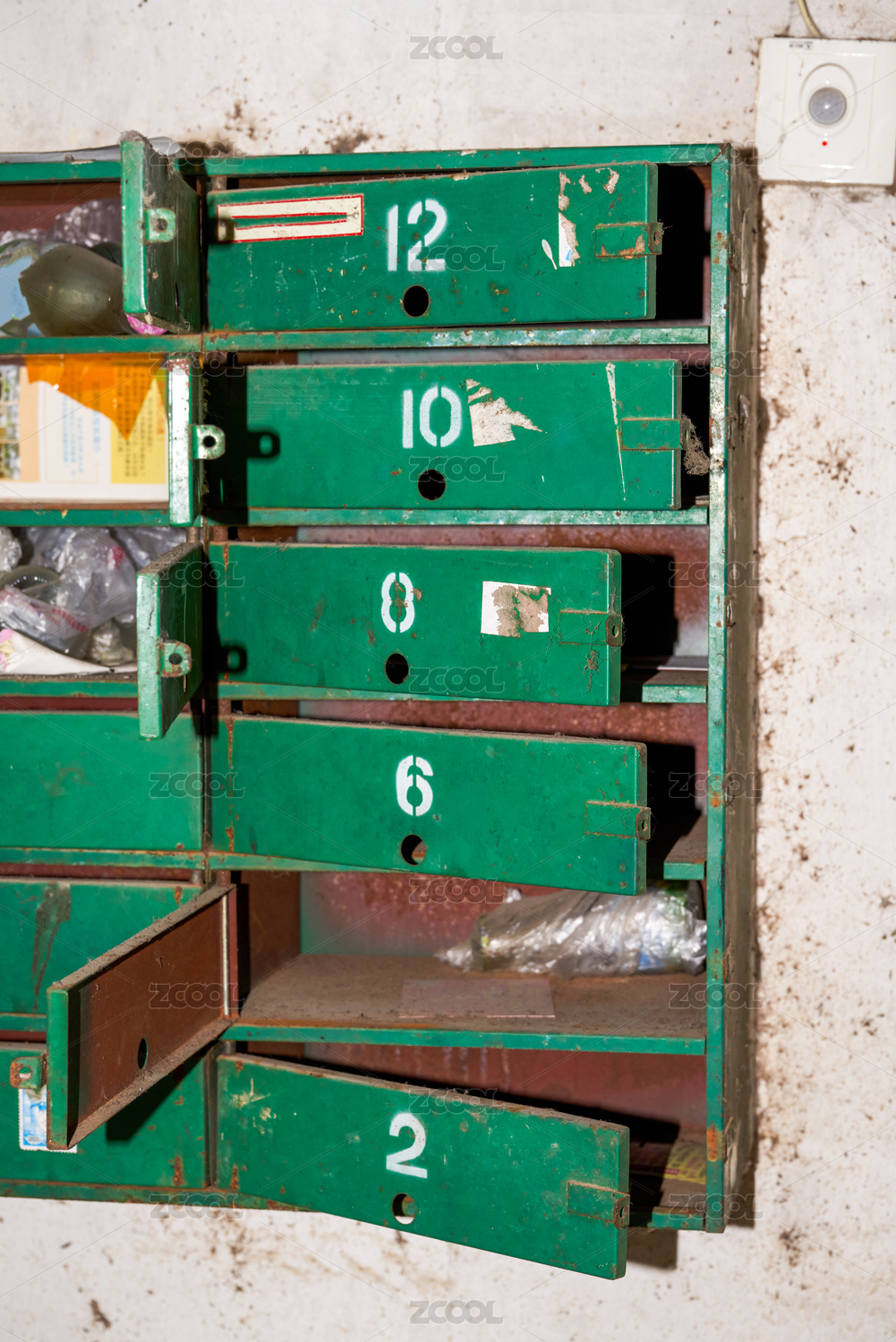 老旧的绿色金属邮箱柜子