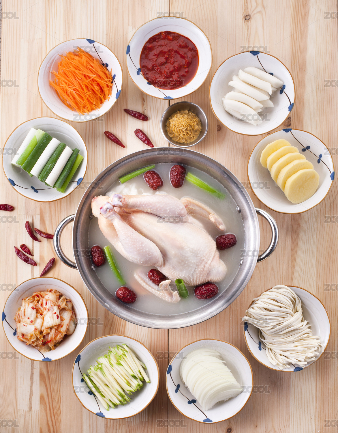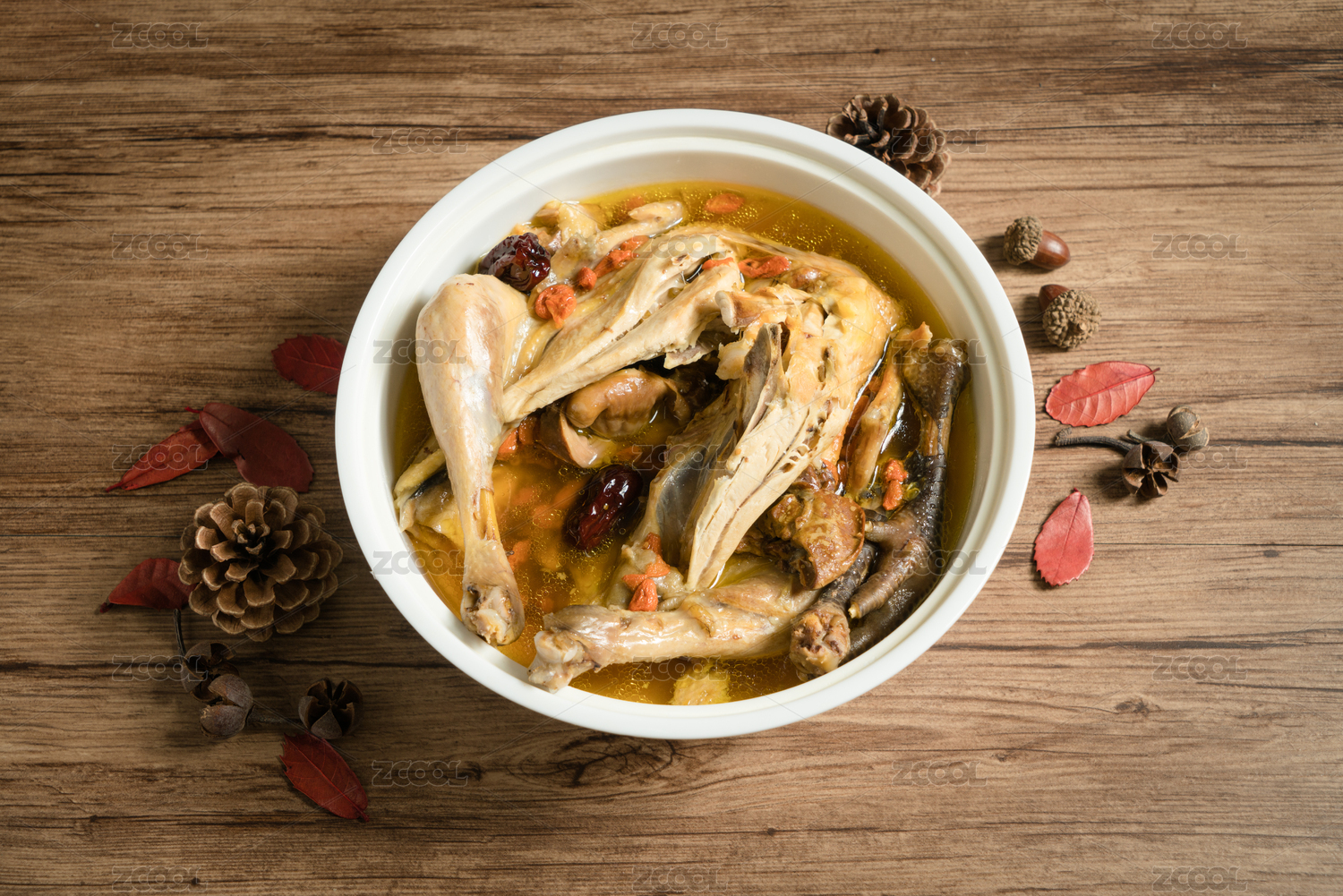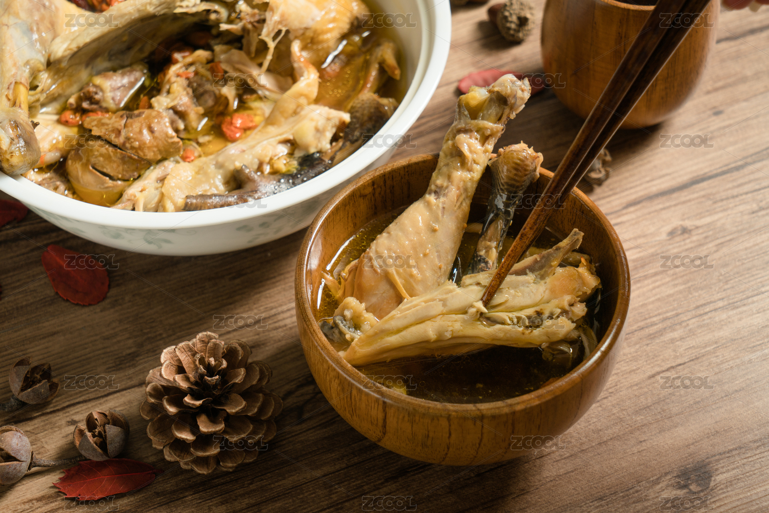 木板上放着的滋补鸡汤锅
