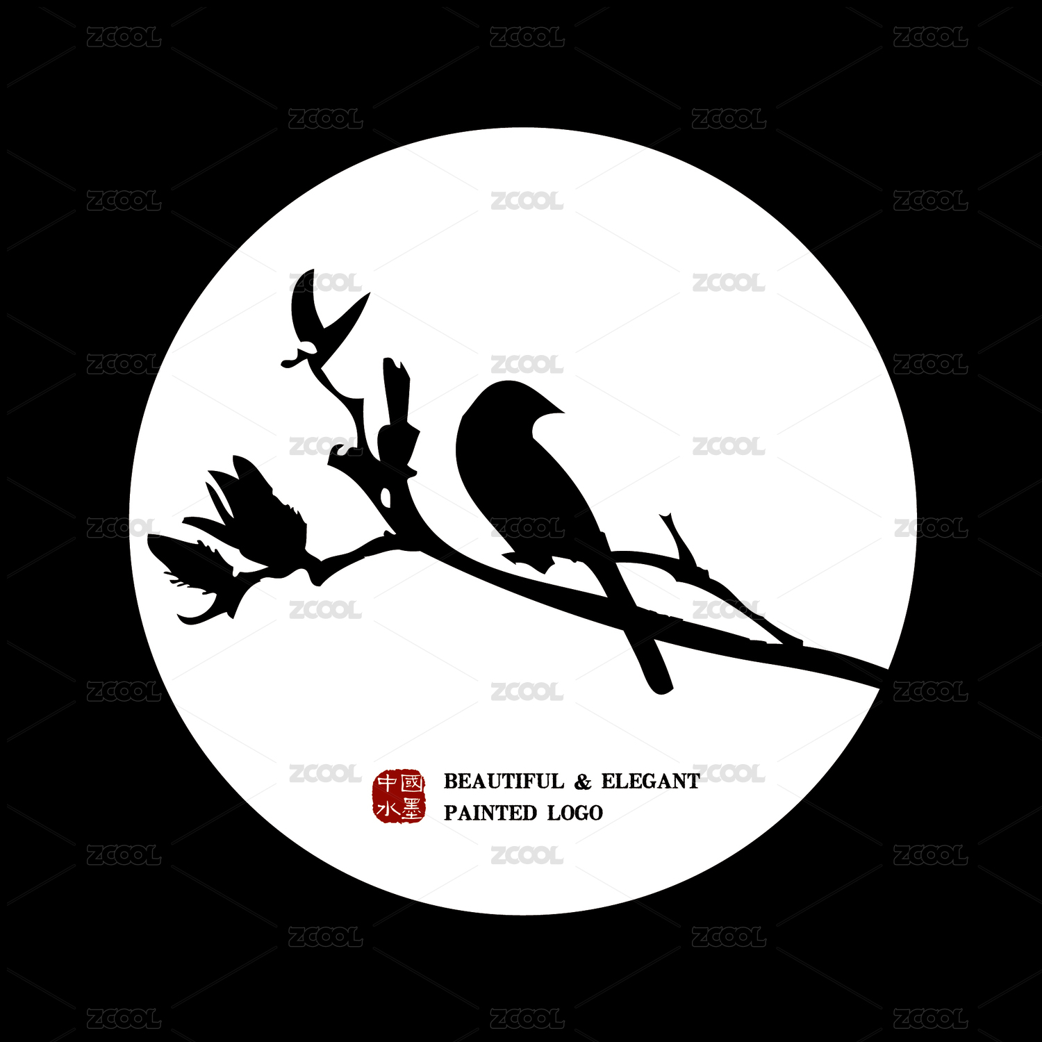 中国古典优雅 杏枝手绘 喜鹊雀鸟水墨中国画 矢量剪影 标志元素