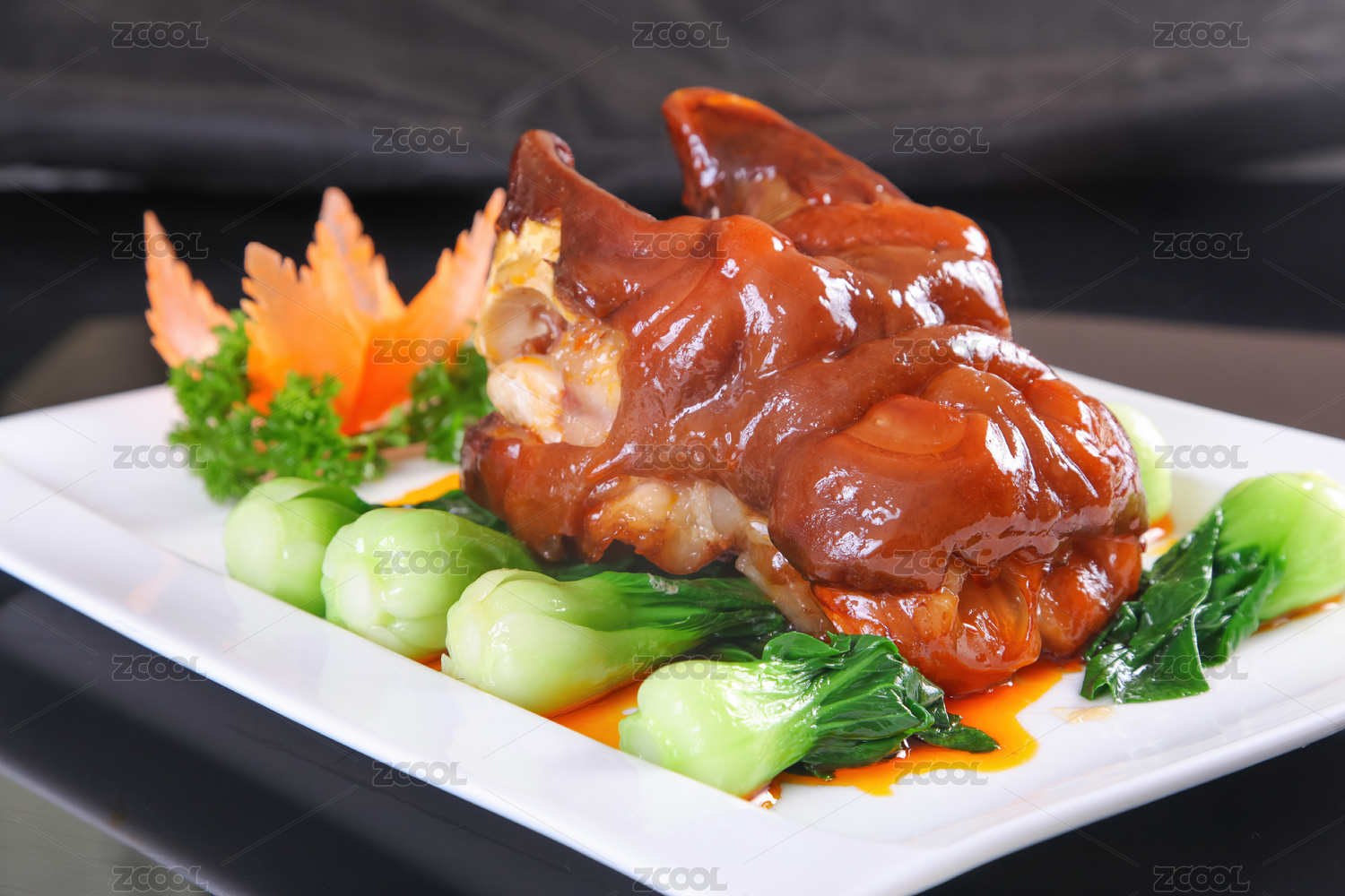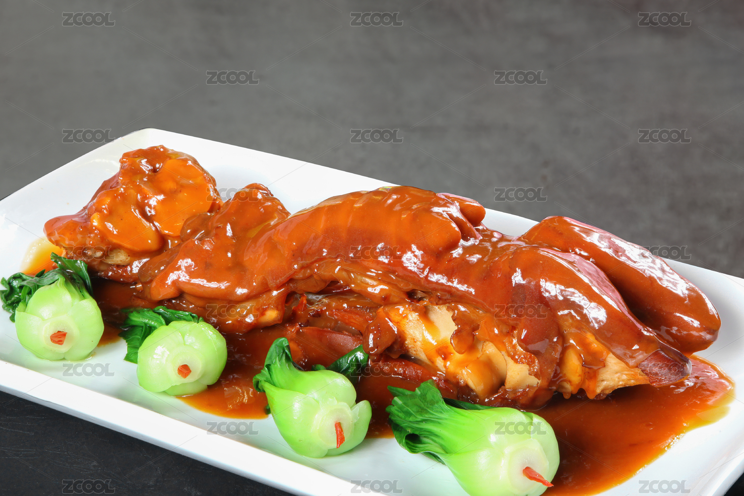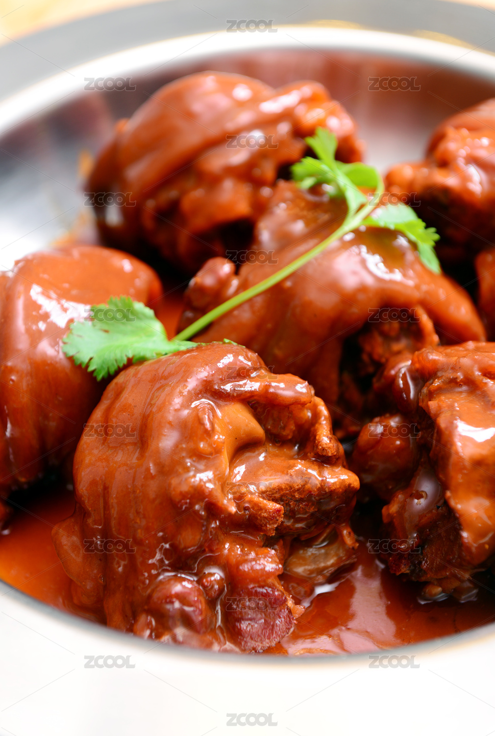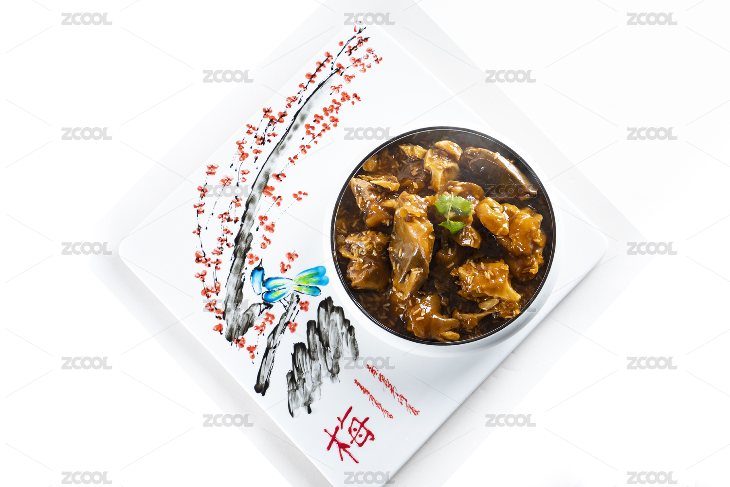 画有花鸟点缀的白色方形瓷盘盛装的一碗红烧牛蹄