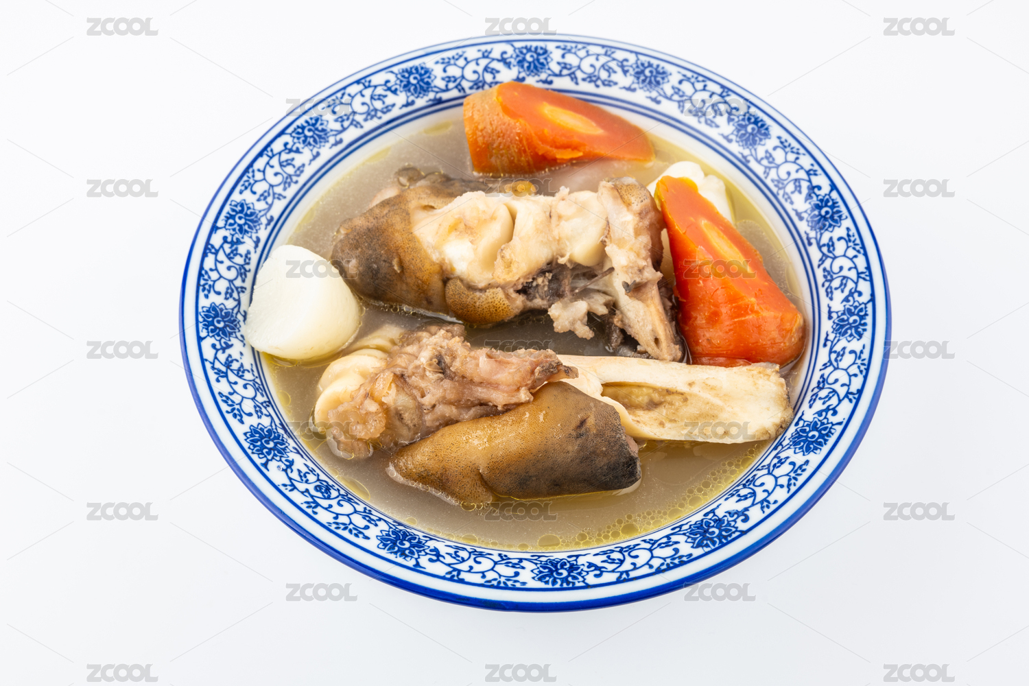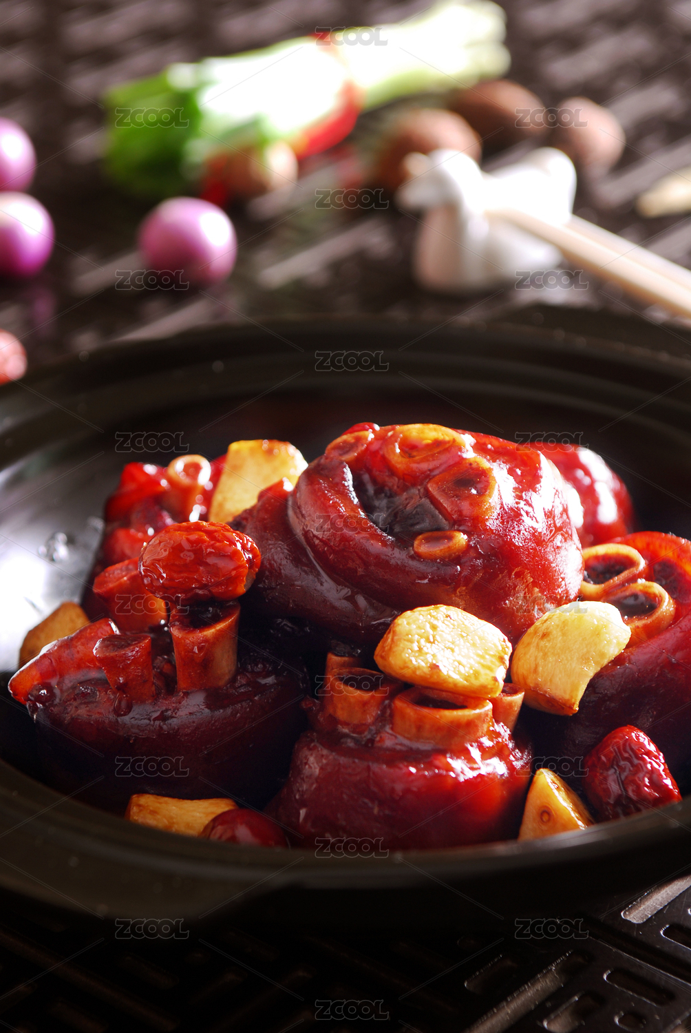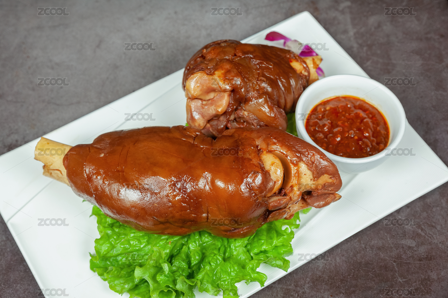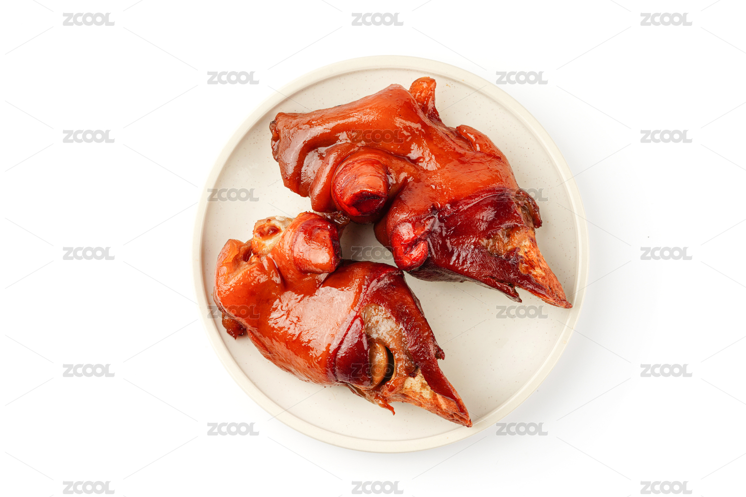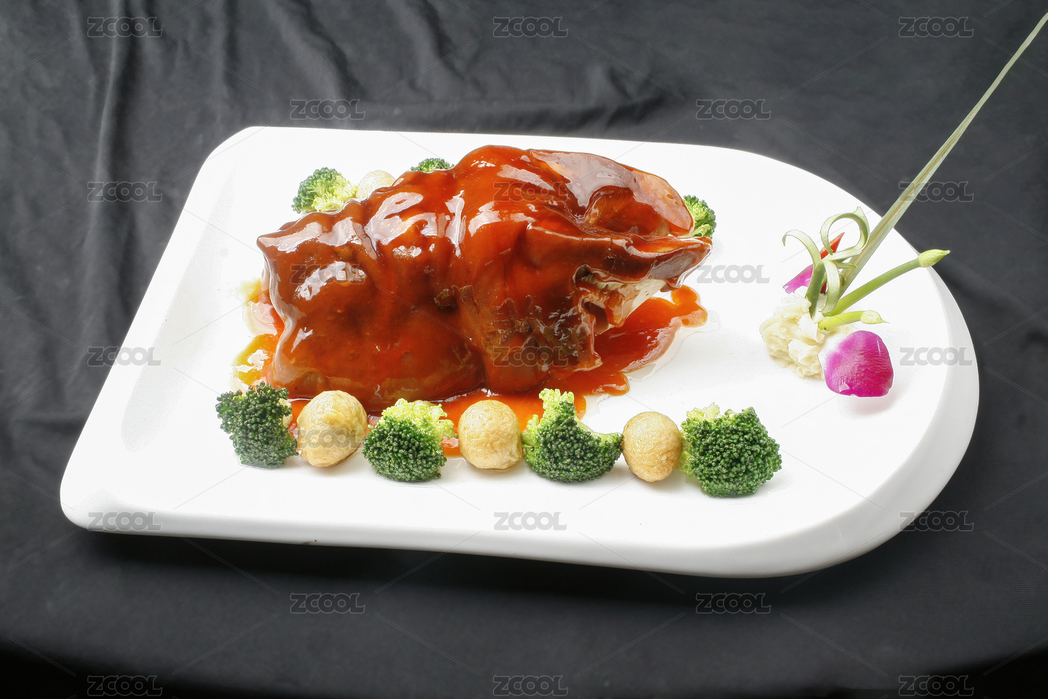 画有花鸟点缀的白色方形瓷盘盛装的一碗红烧牛蹄