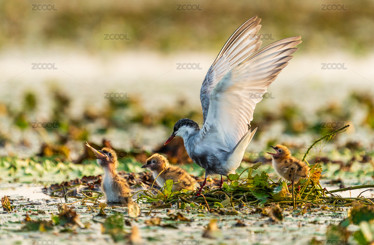 江苏苏州戗港太湖须浮鸥哺育幼鸟