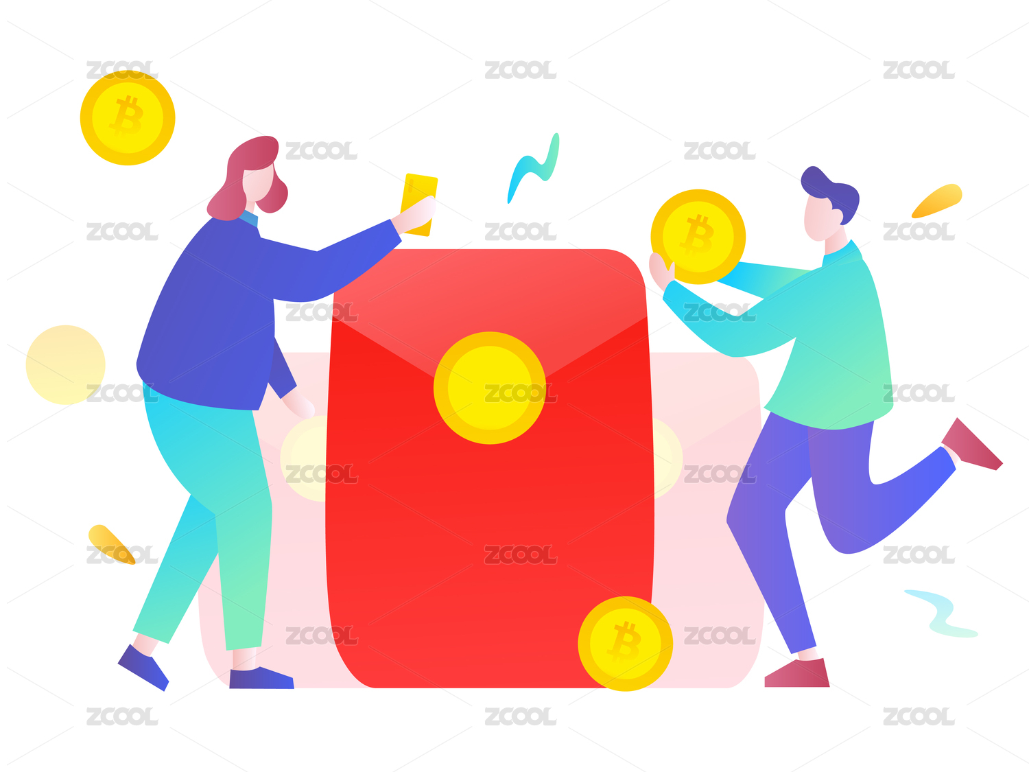 男女使用手机邀请好友获得红包比特币返现,矢量扁平概念插画