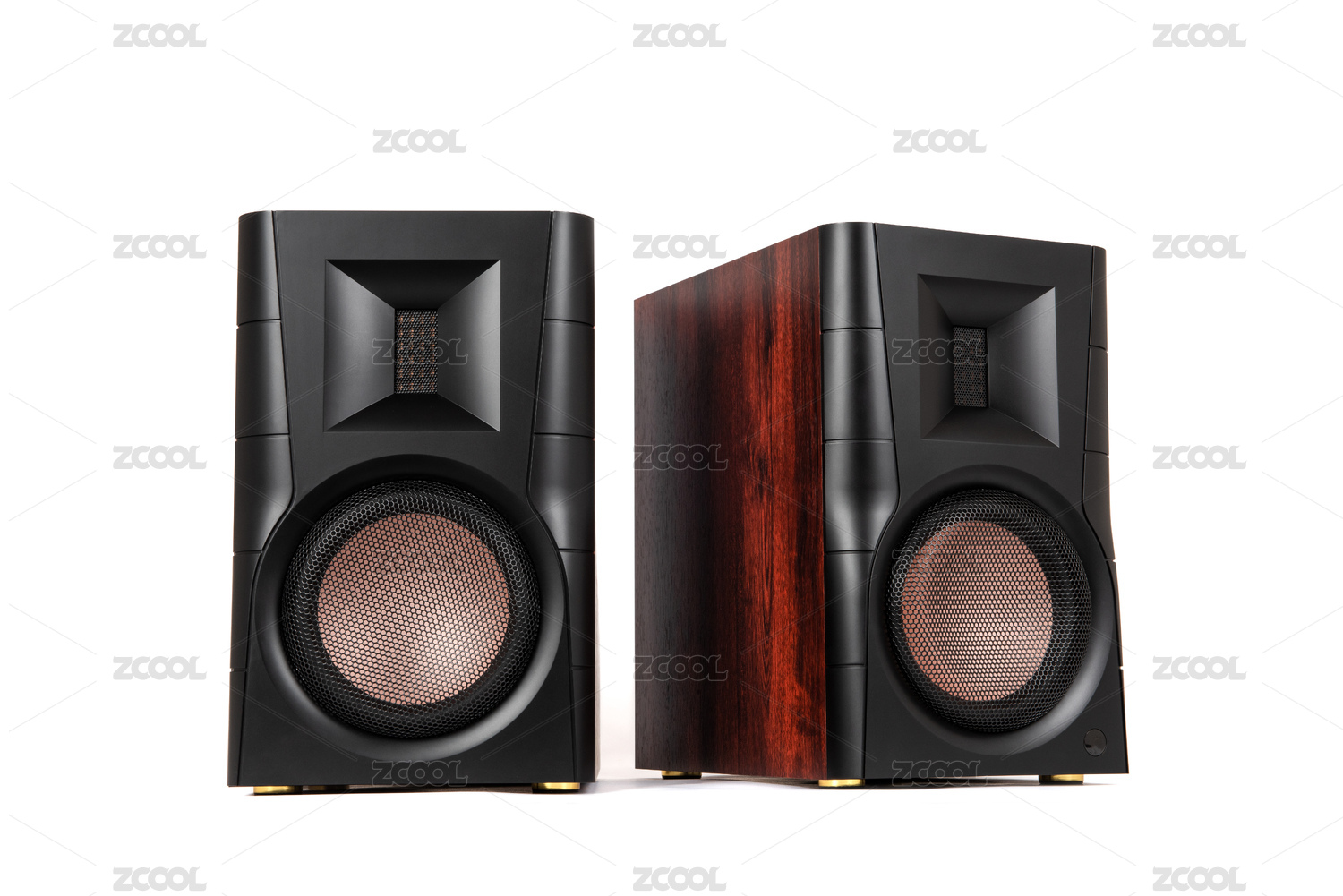白色背景上的一对黑色木质音箱