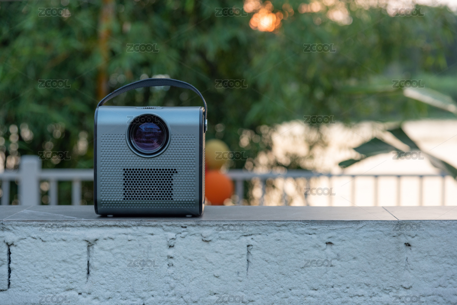 一个方形手提式蓝牙音箱摆放在户外