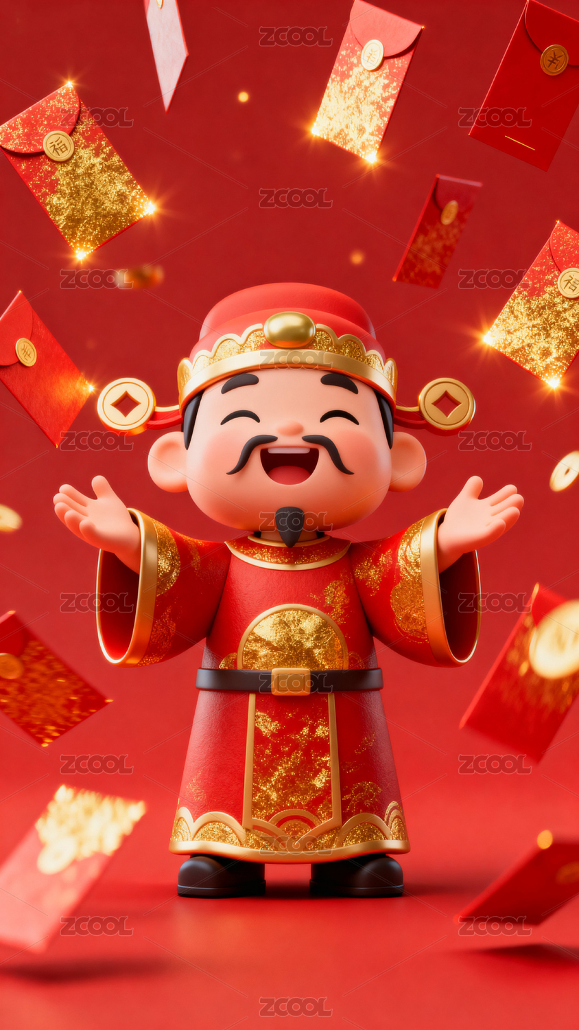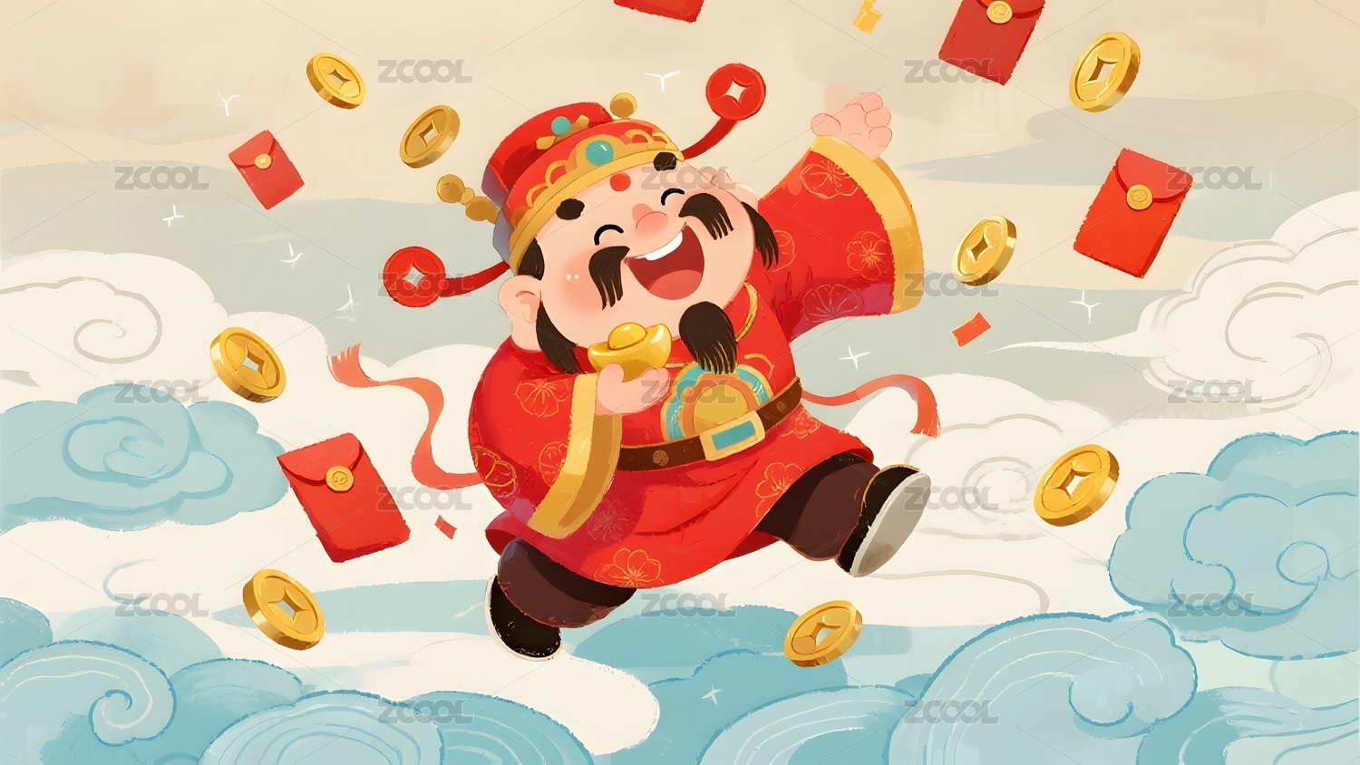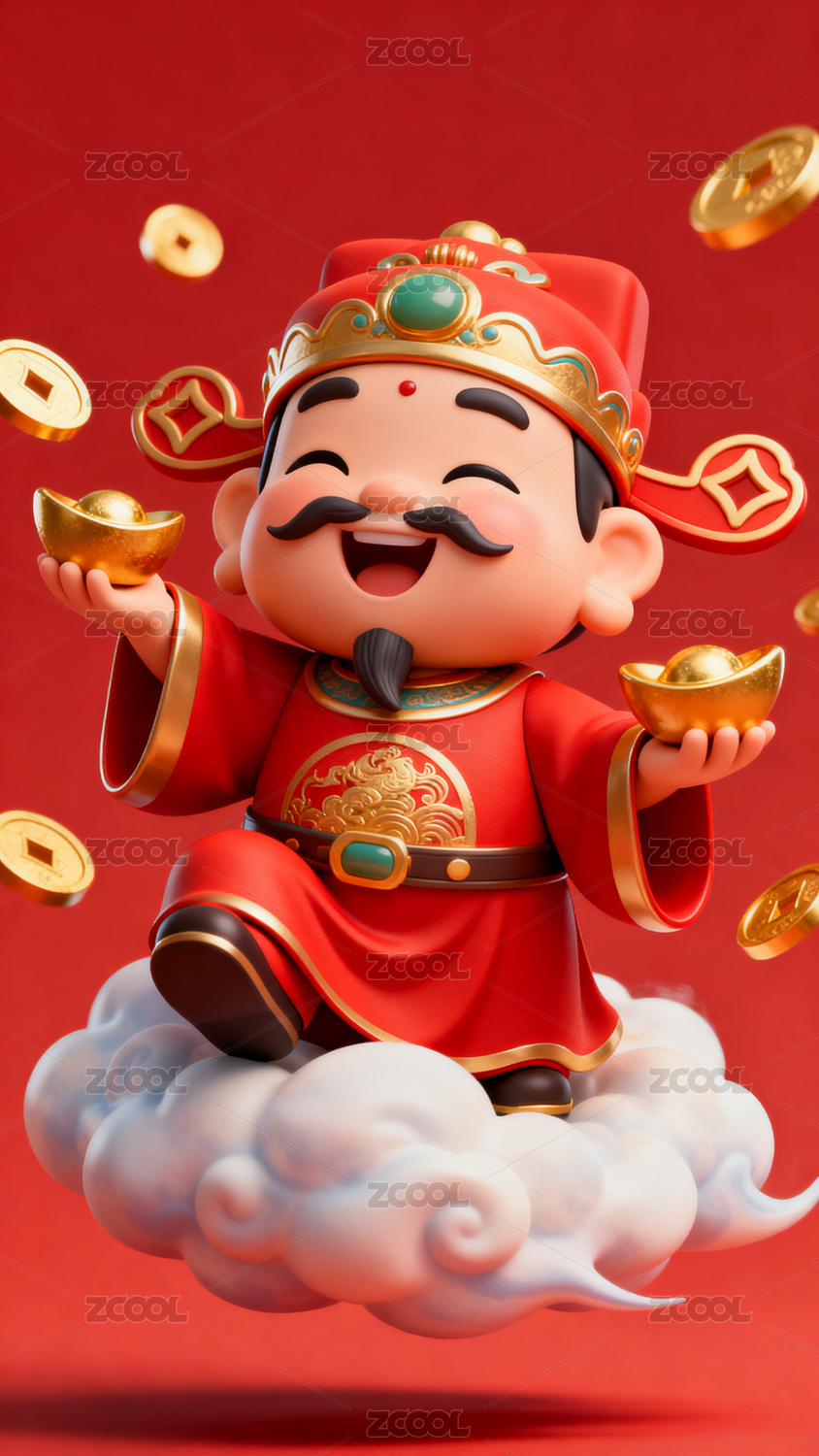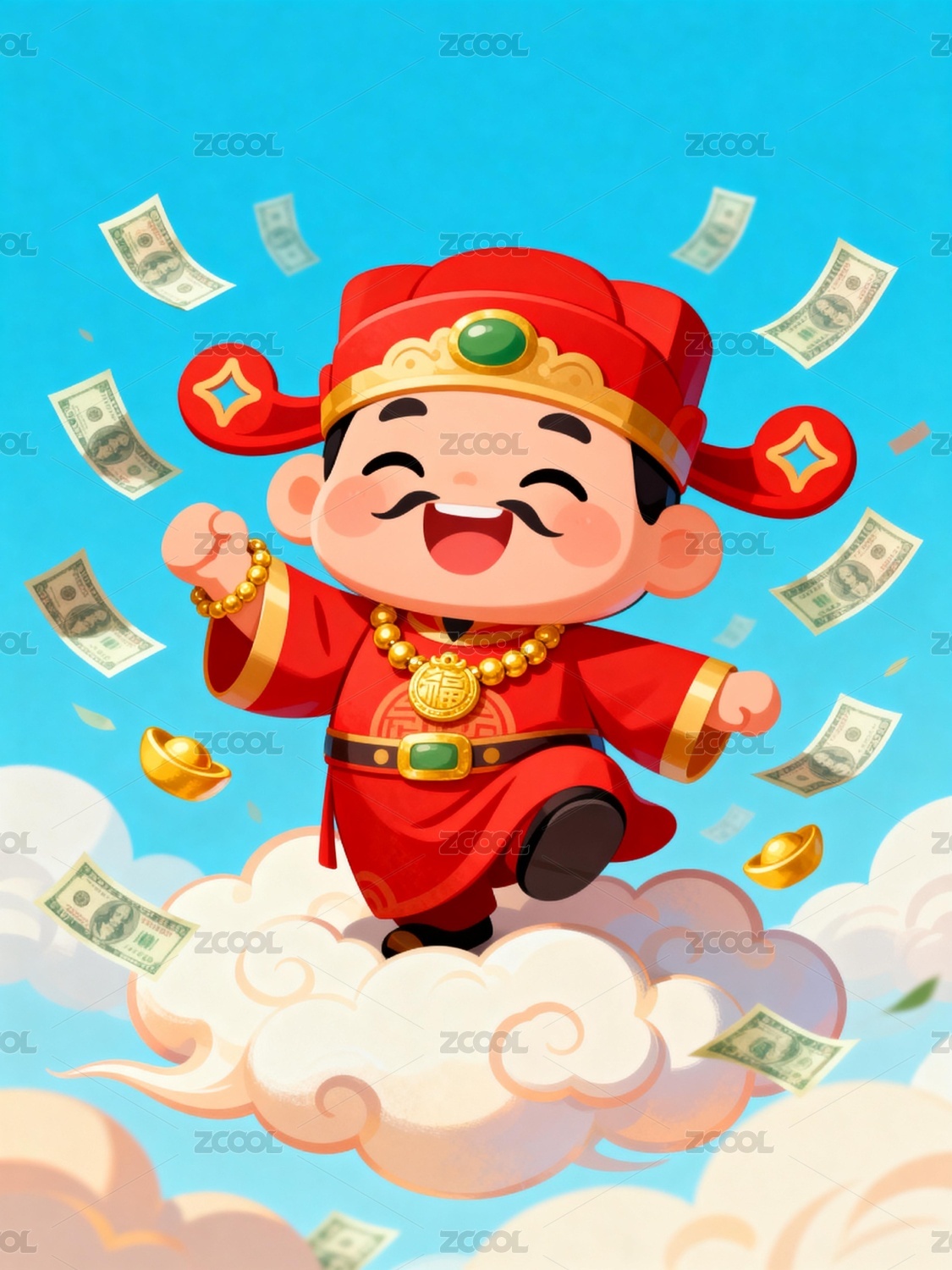 3D卡通可爱Q版财神爷驾云空中开心撒钱