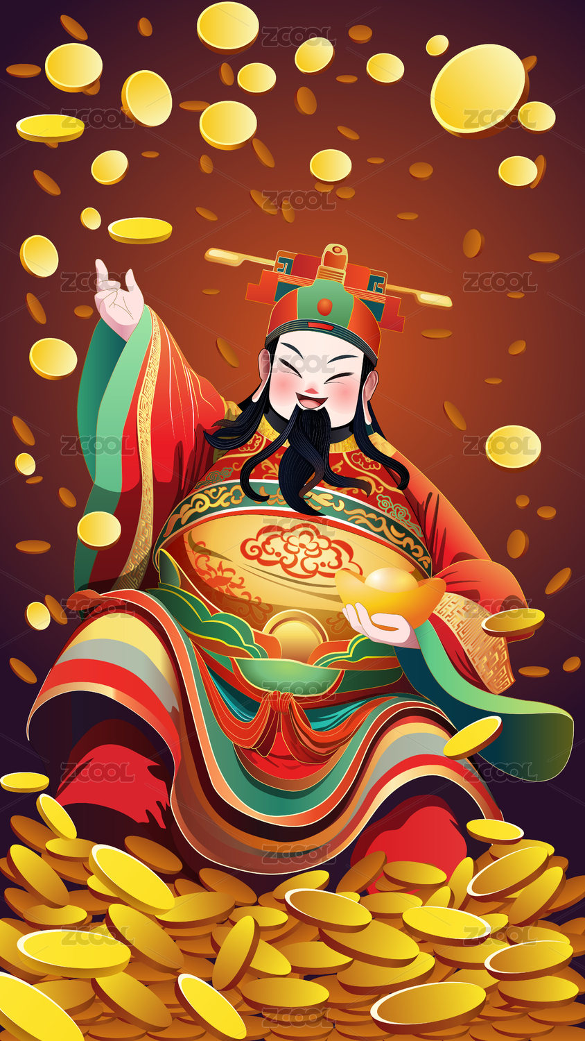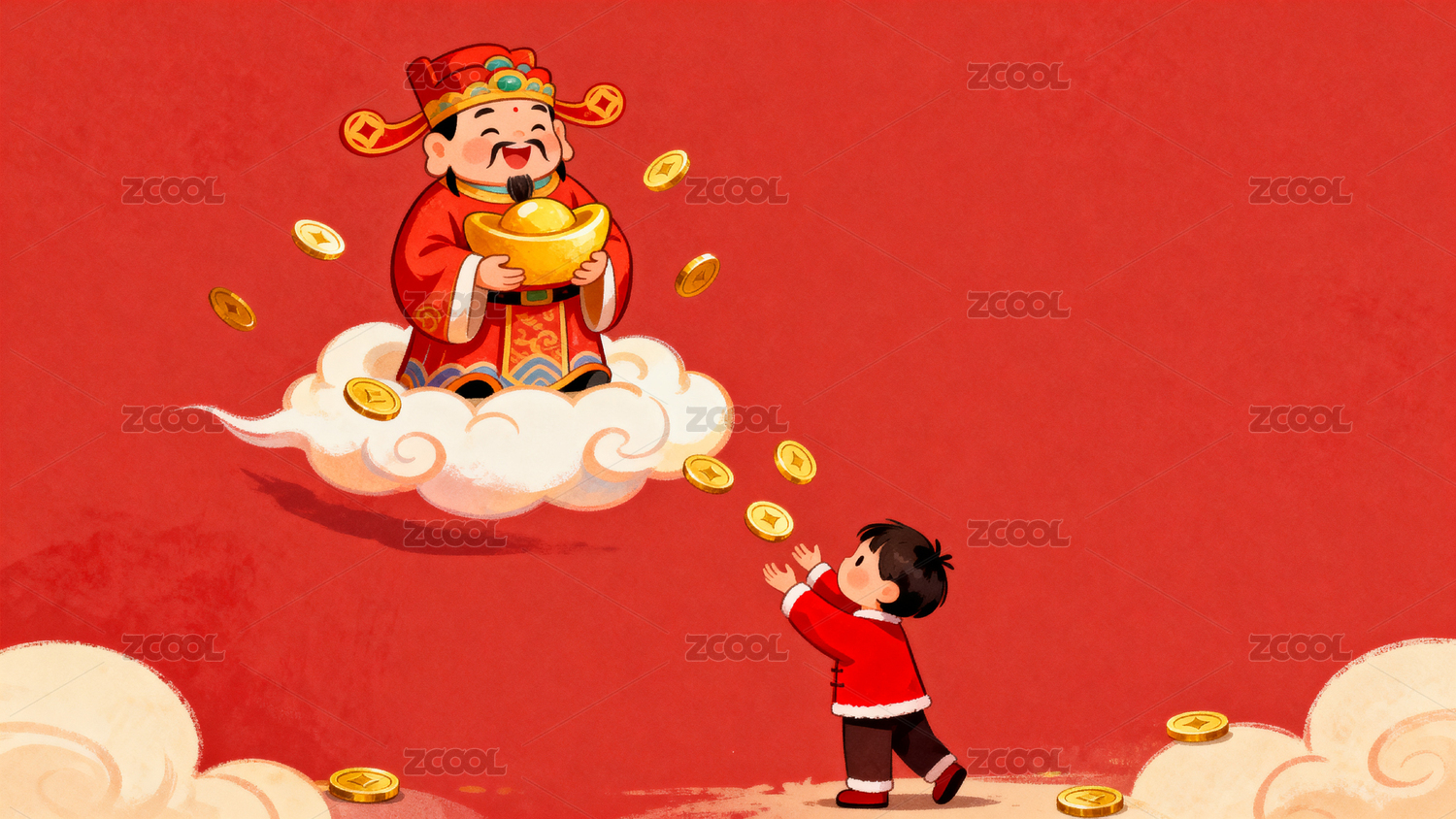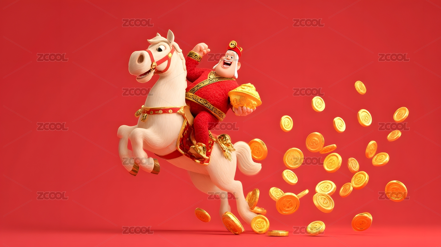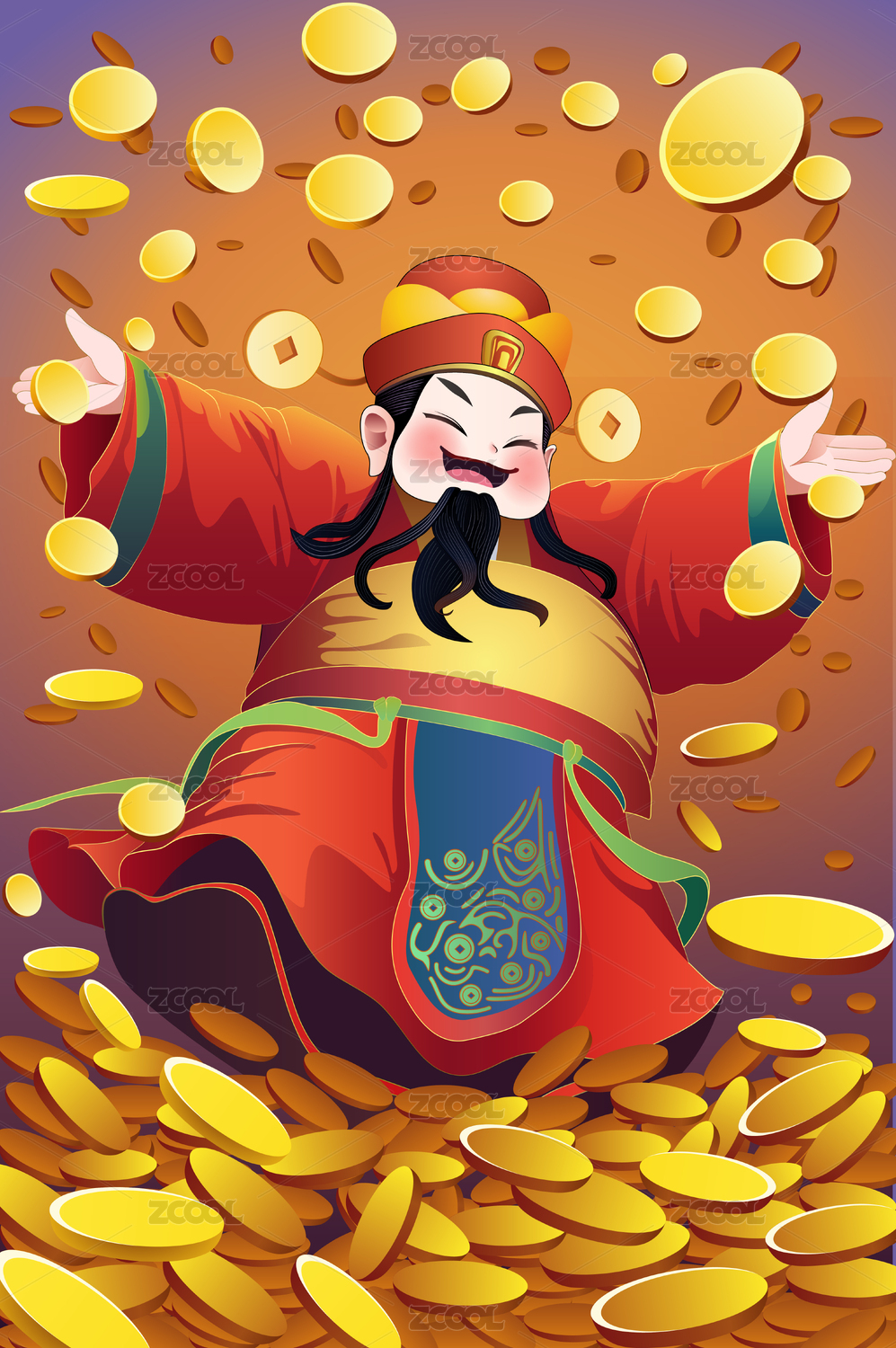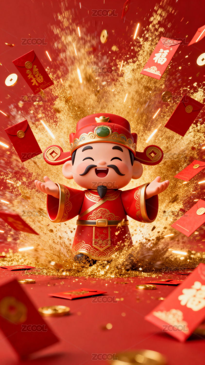 3D卡通可爱Q版财神爷驾云空中开心撒钱