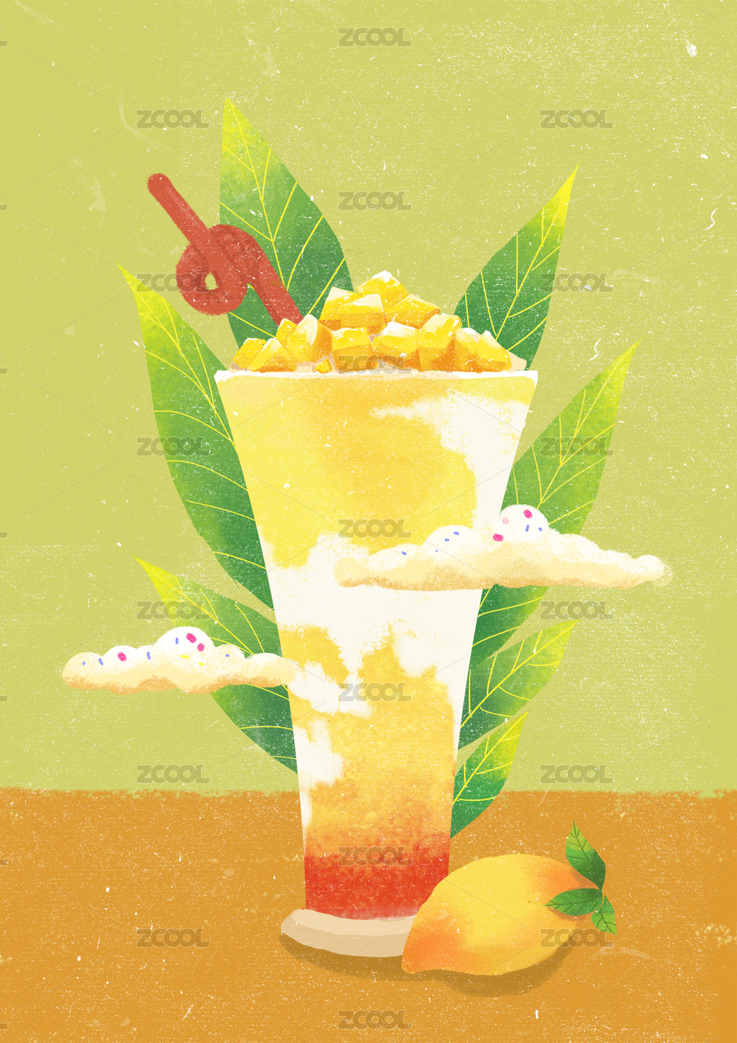黄绿背景下甜蜜清爽的芒果奶昔