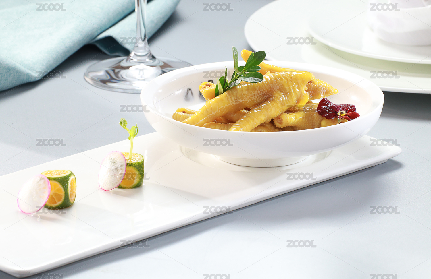 浅灰色背景上白色长条盘上瓷碗里的泡椒凤爪