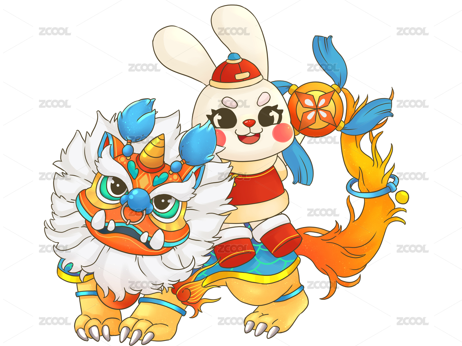 年兽和兔子或福娃过新年迎新春兔子绣球