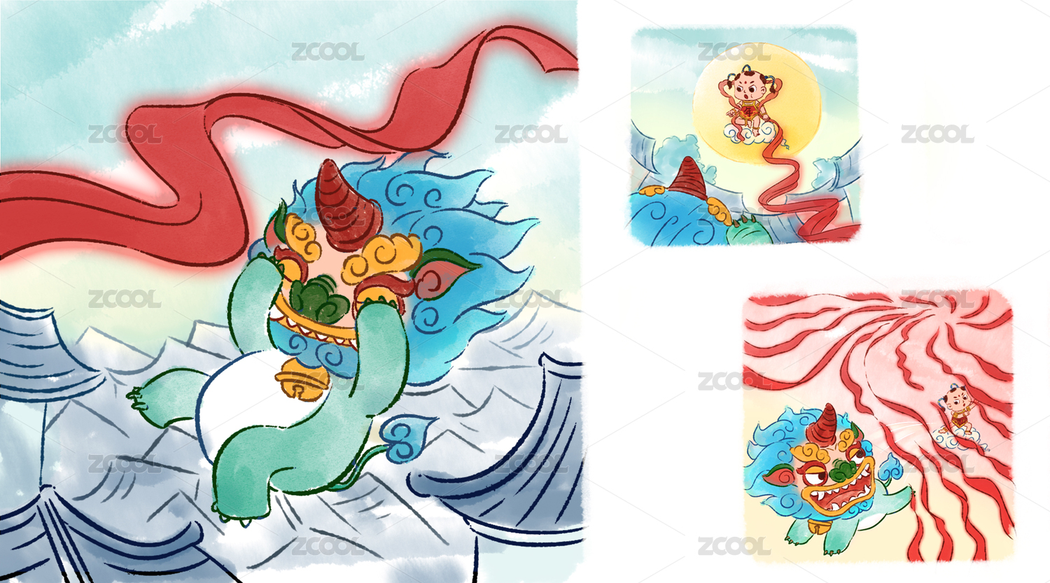 醒狮年兽卡通元素矢量插画