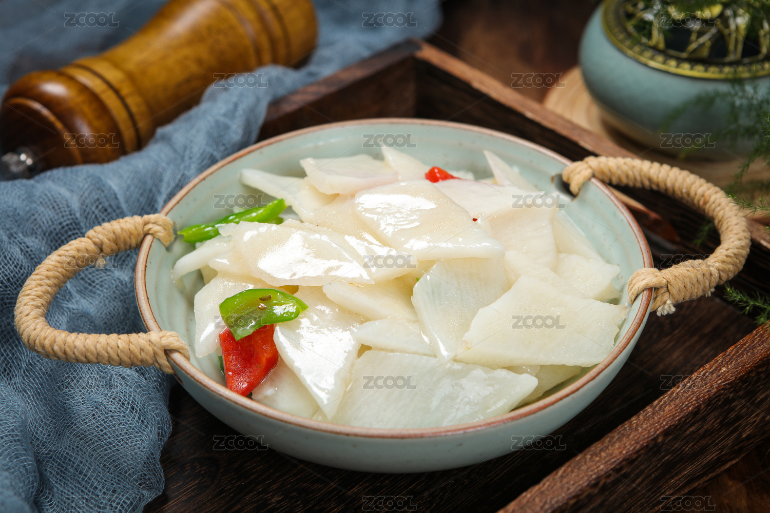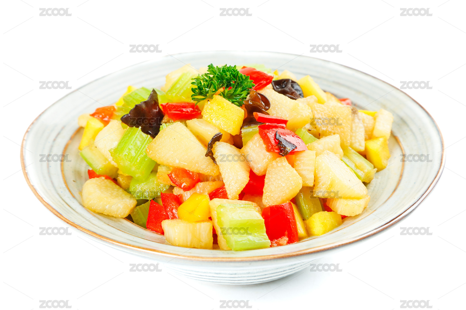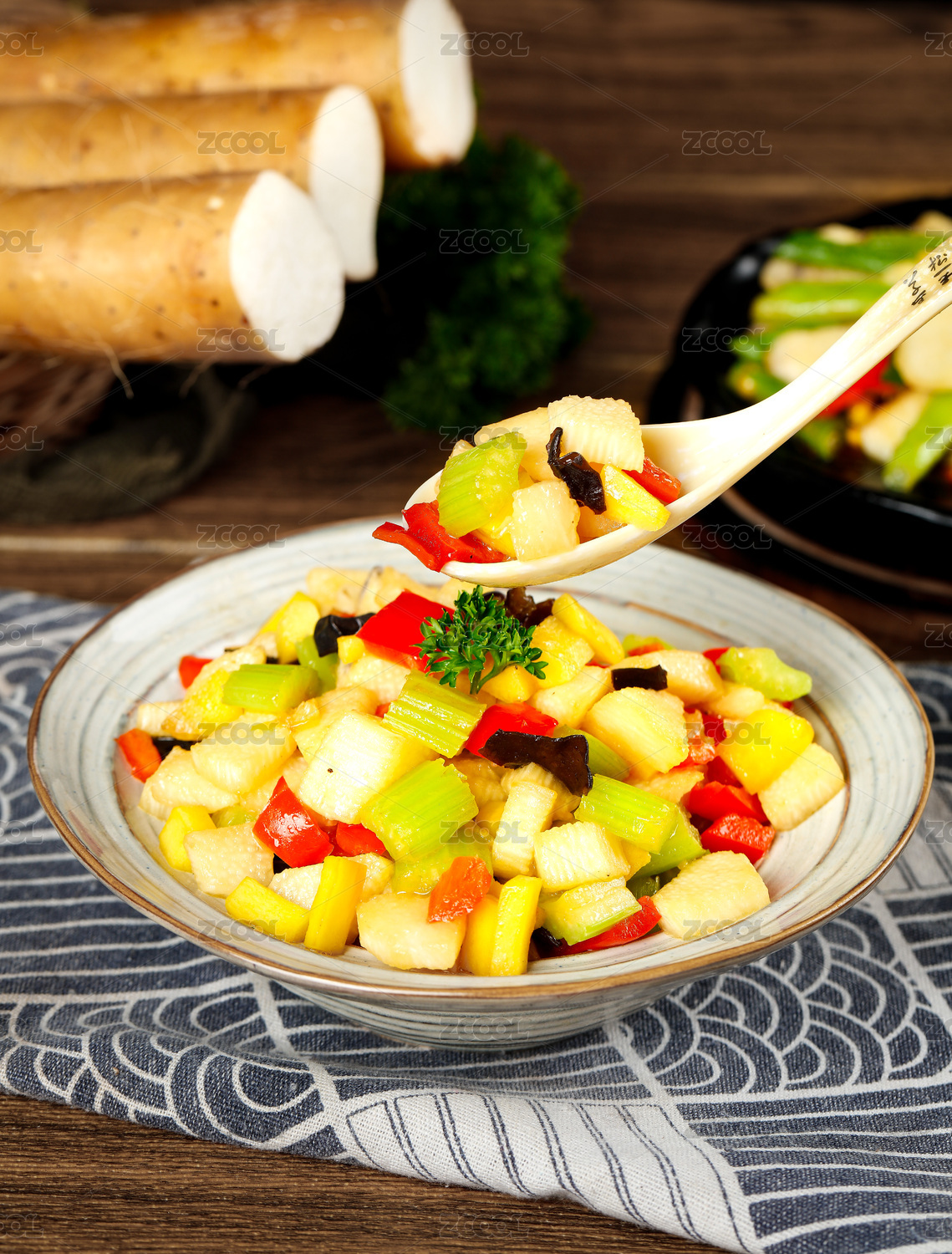 花纹底上放着一盘西芹炒山药和勺子挖着山药