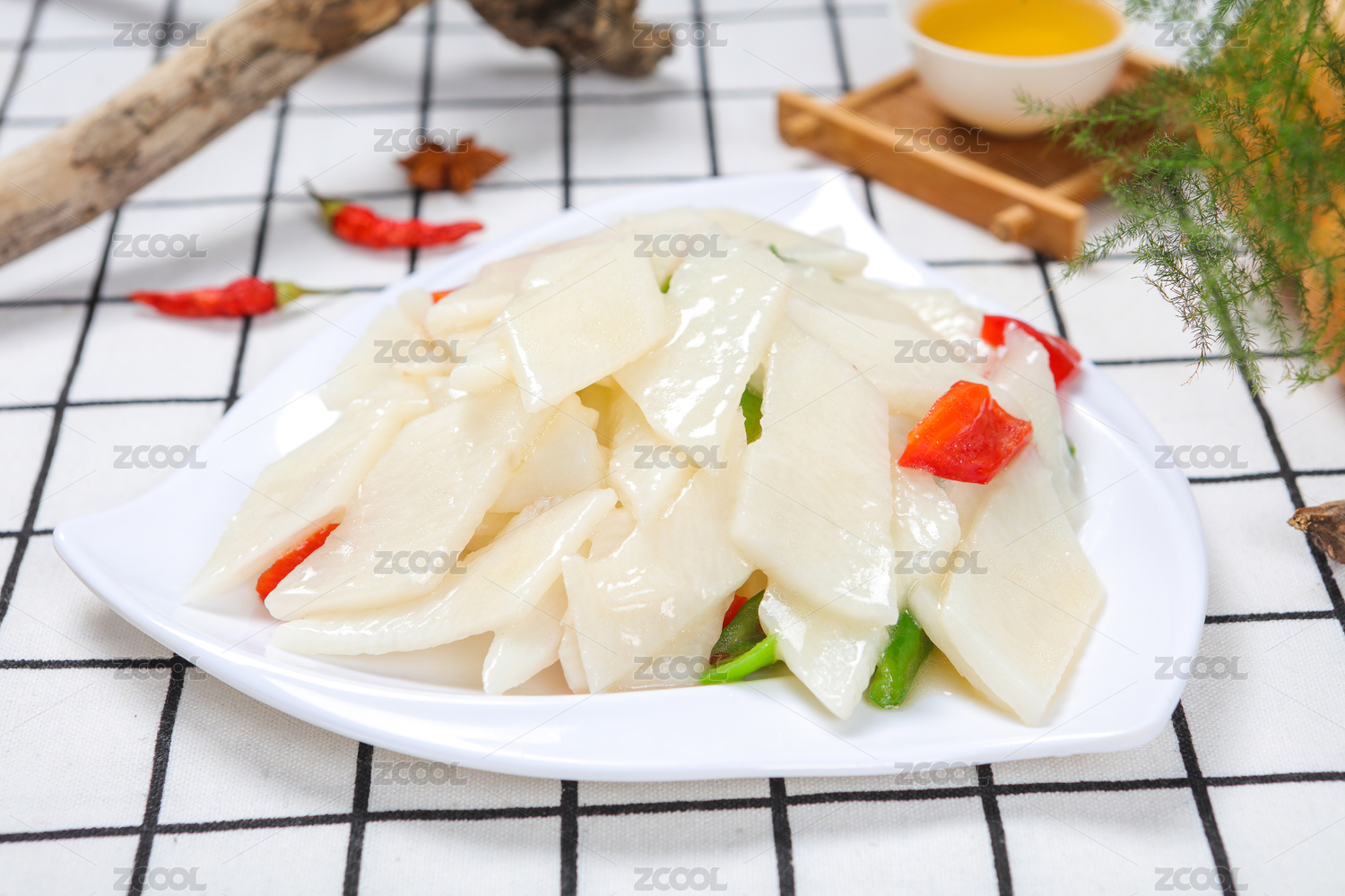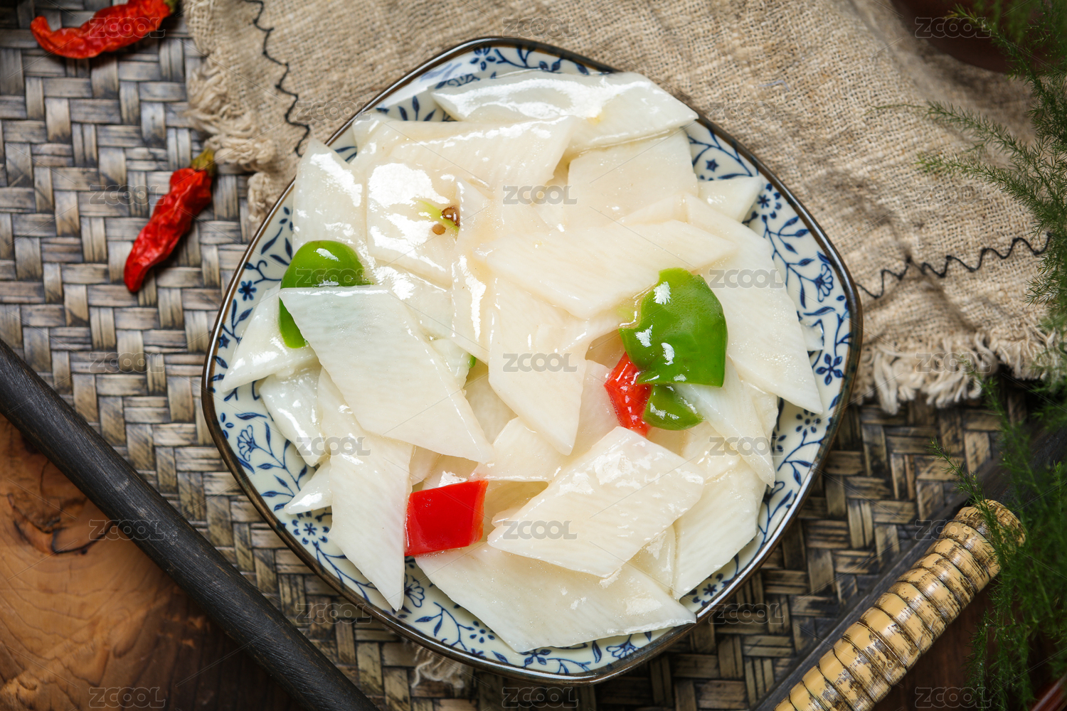 白底上放着一盘芹菜炒山药