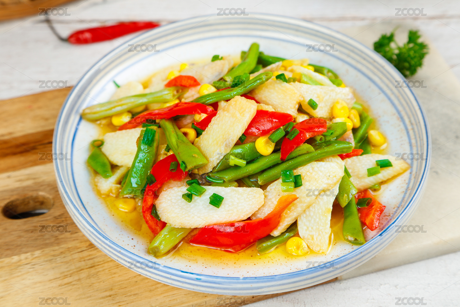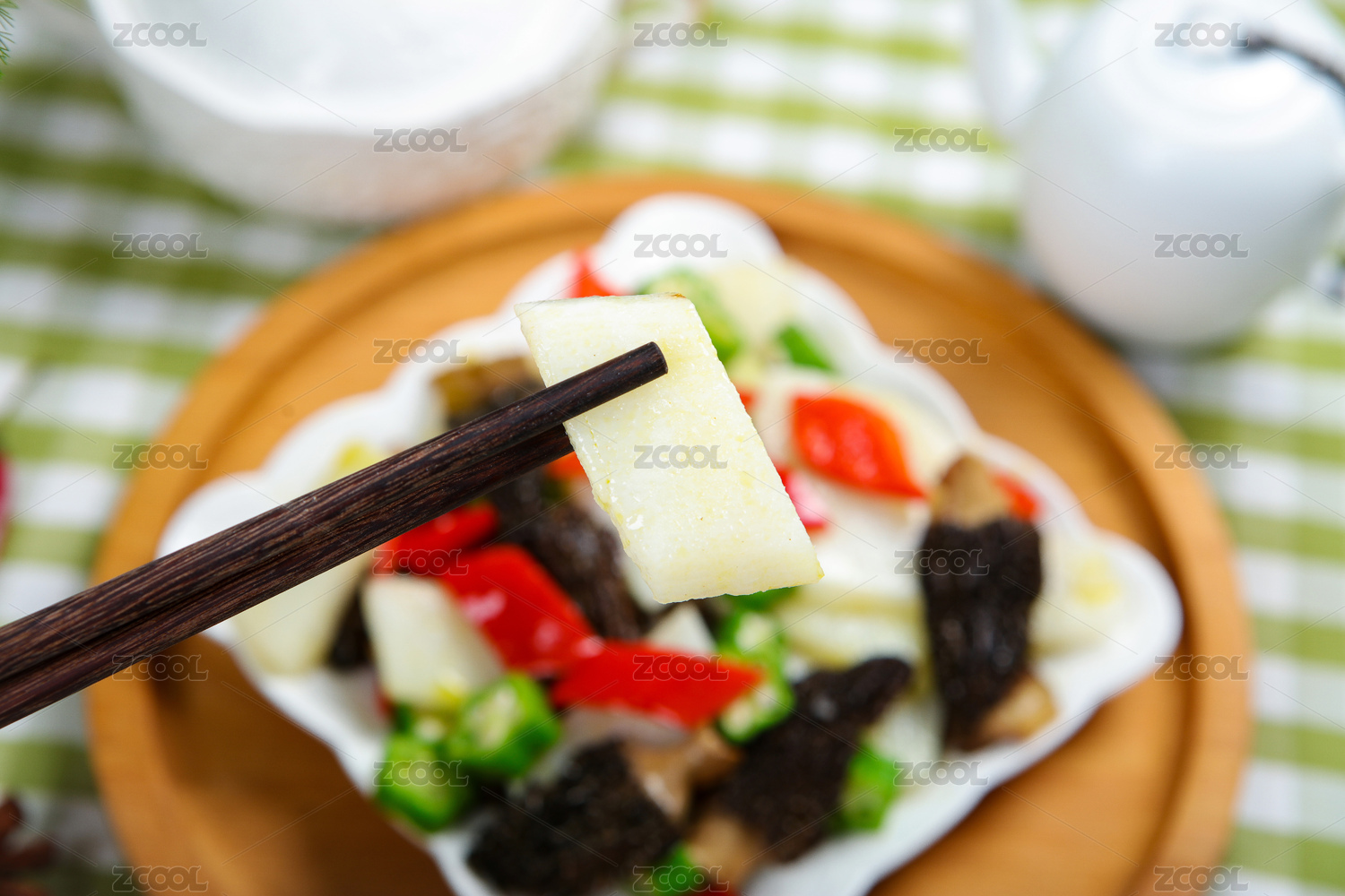 双拼板上放着一盘菜椒炒山药