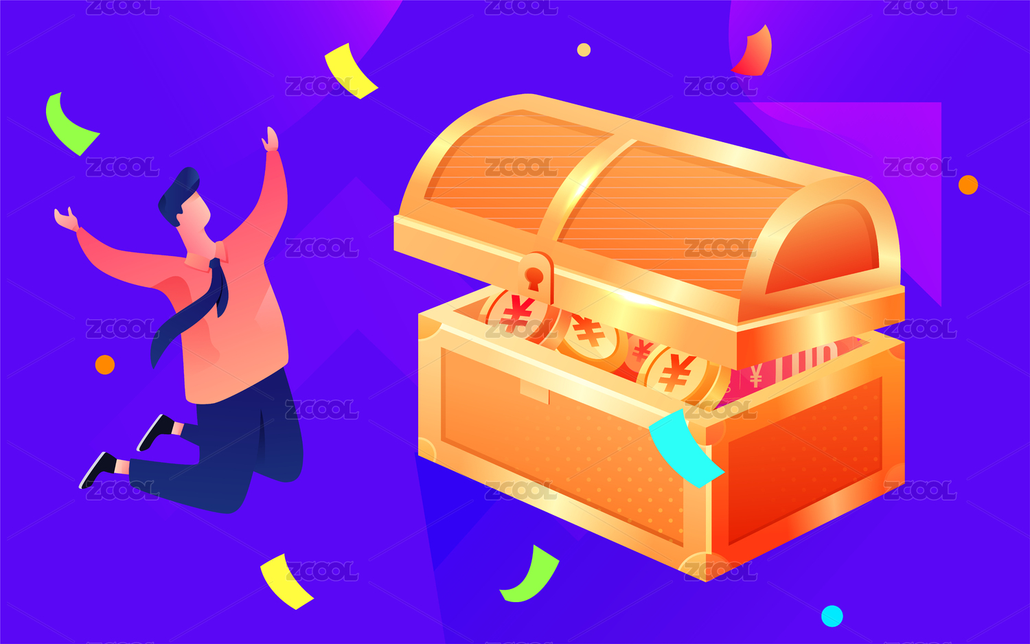 卡通人物中奖宝箱高兴场面矢量插画背景素材