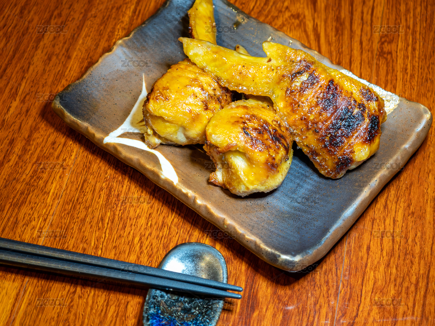 盛放在质朴陶瓷盘上的日式烤鸡翅