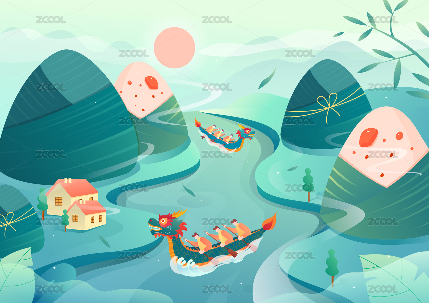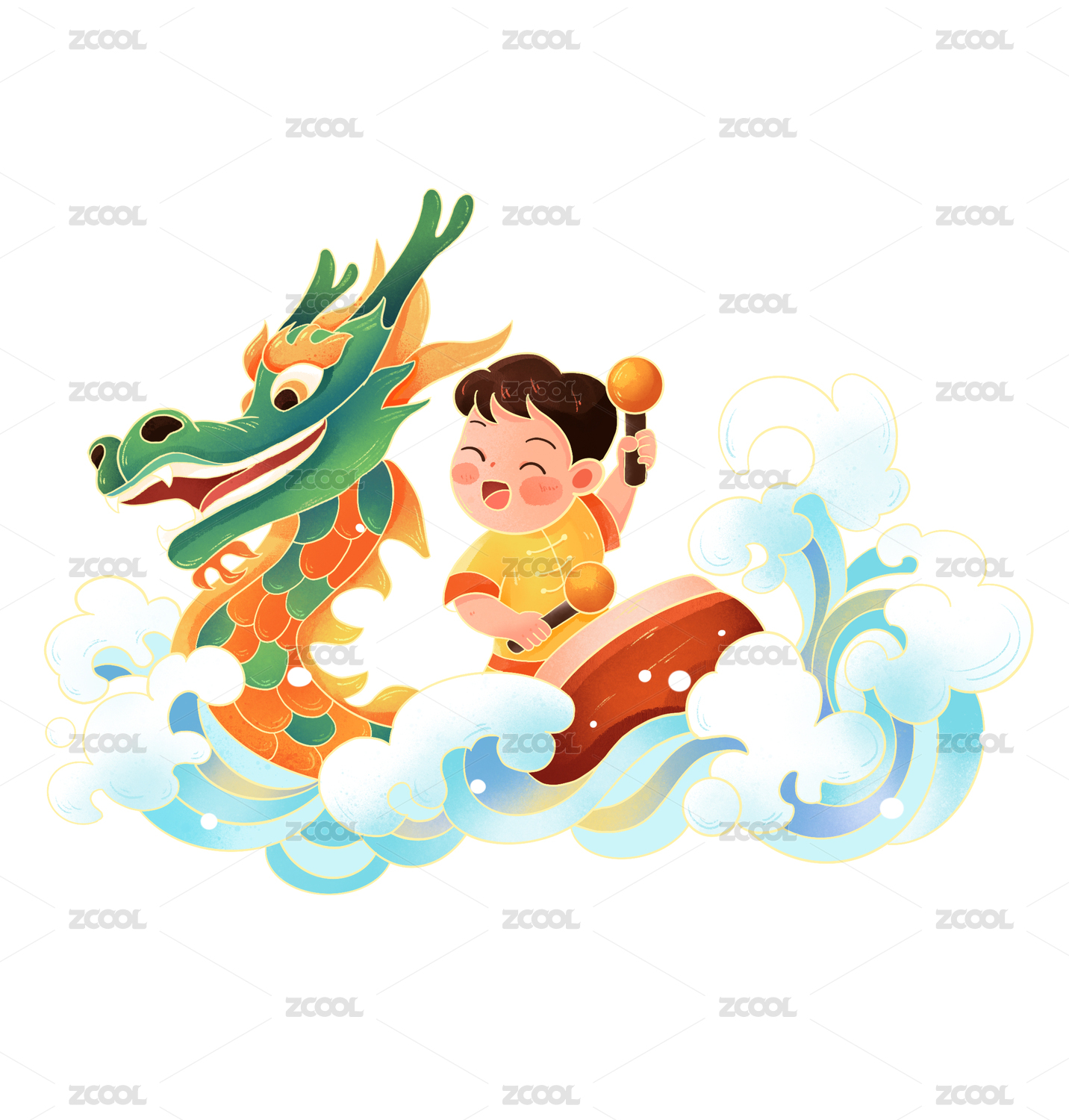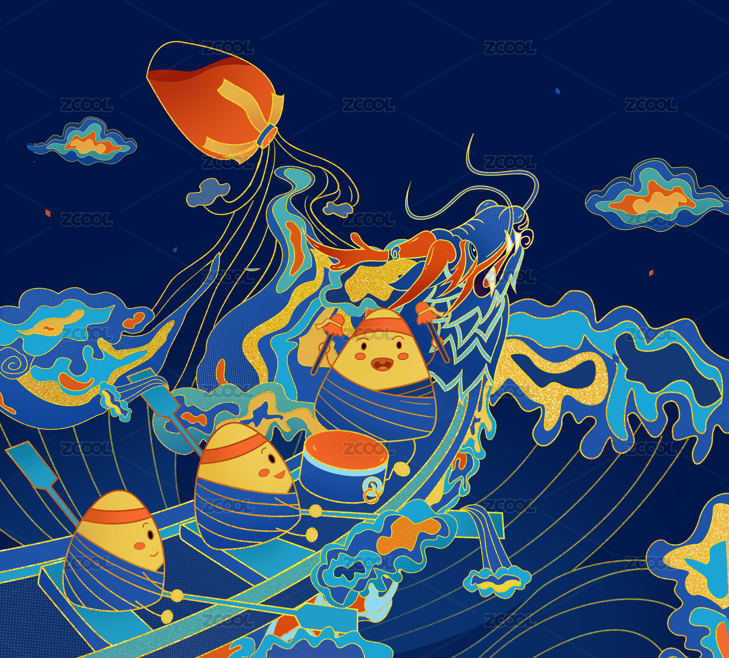 国风端午节带着粽子的龙舟插画