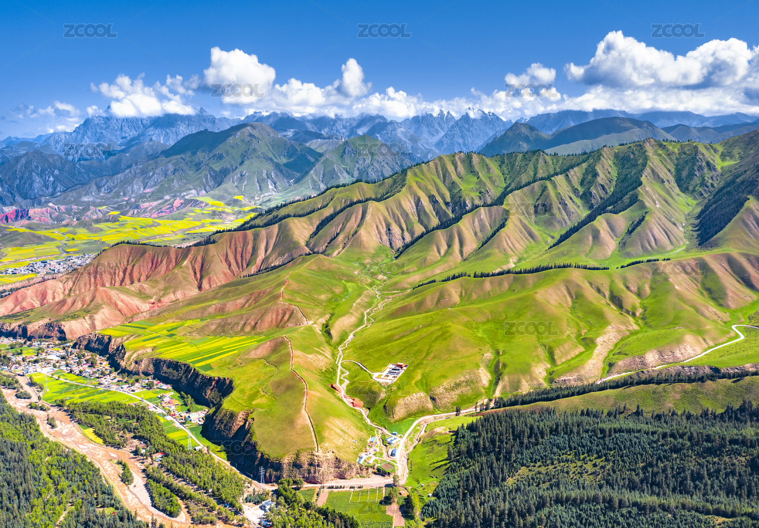 青海海北门源县祁连山岗什卡雪峰下油菜花海