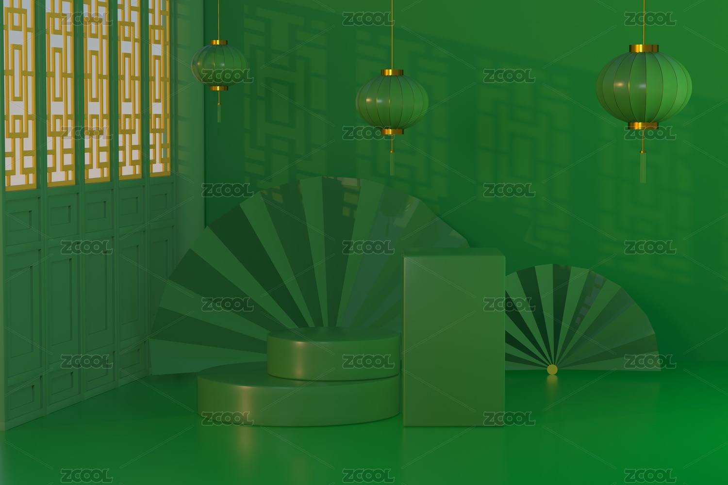 3D渲染的中国风带窗户光影效果展台