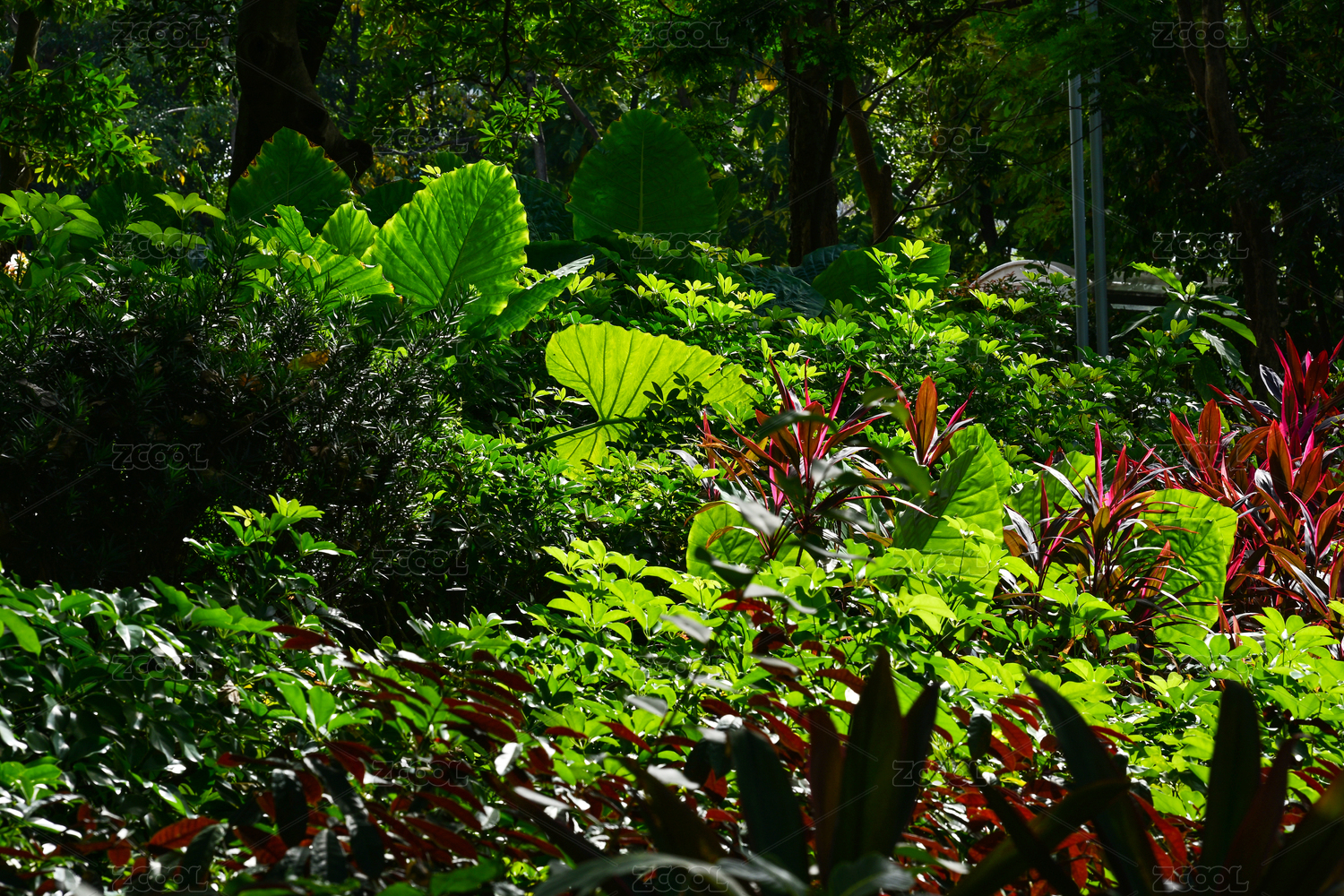 阳光照射下穿透多彩植物光影效果景观