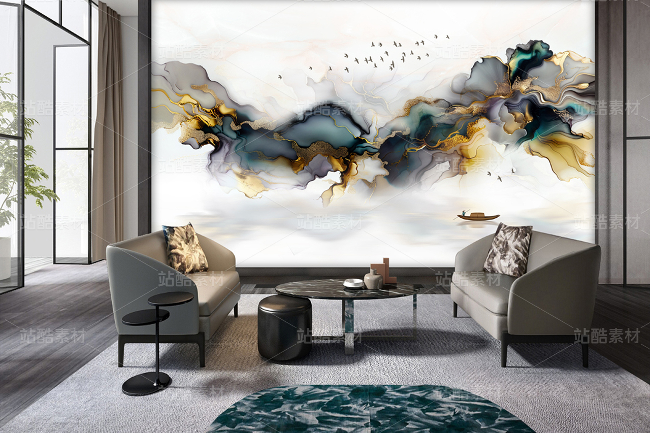 抽象山水中国画曲线玄关背景墙