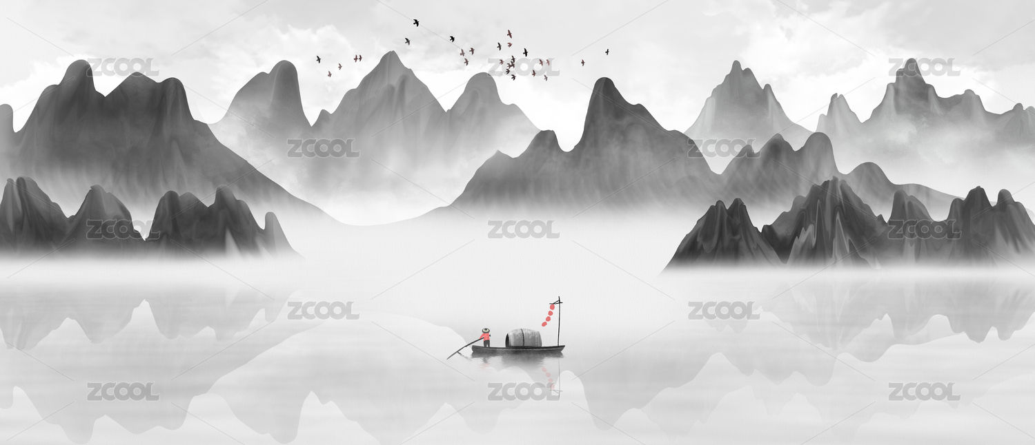 手绘中国风意境水墨山水风景画
