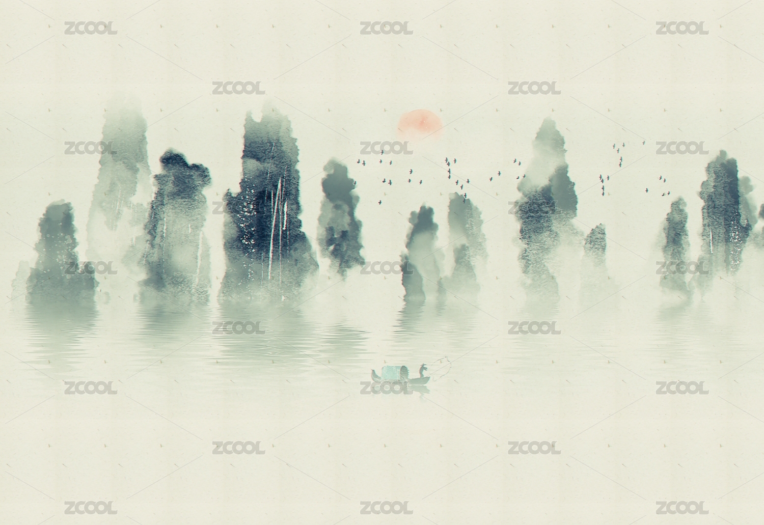 手绘新中式意境水墨山水画
