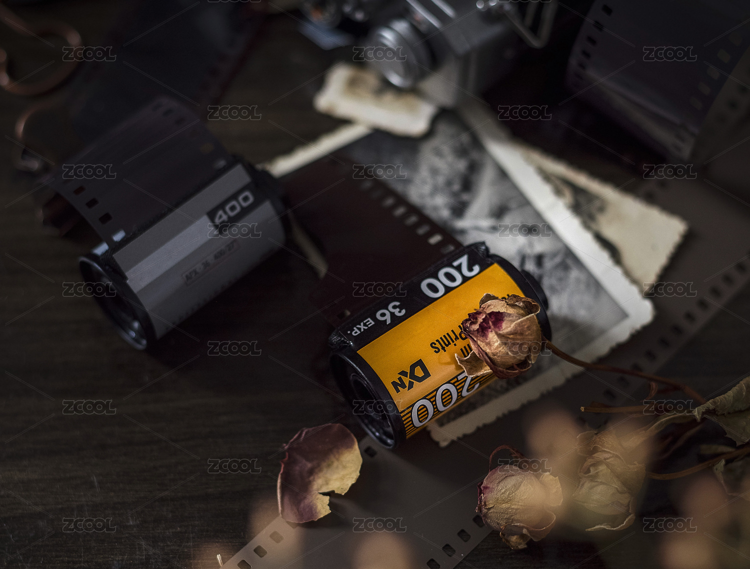 木桌上的胶卷和旧照片俯拍图