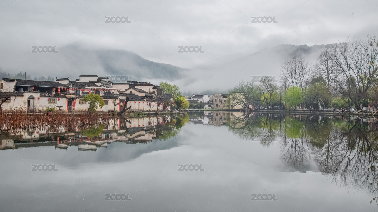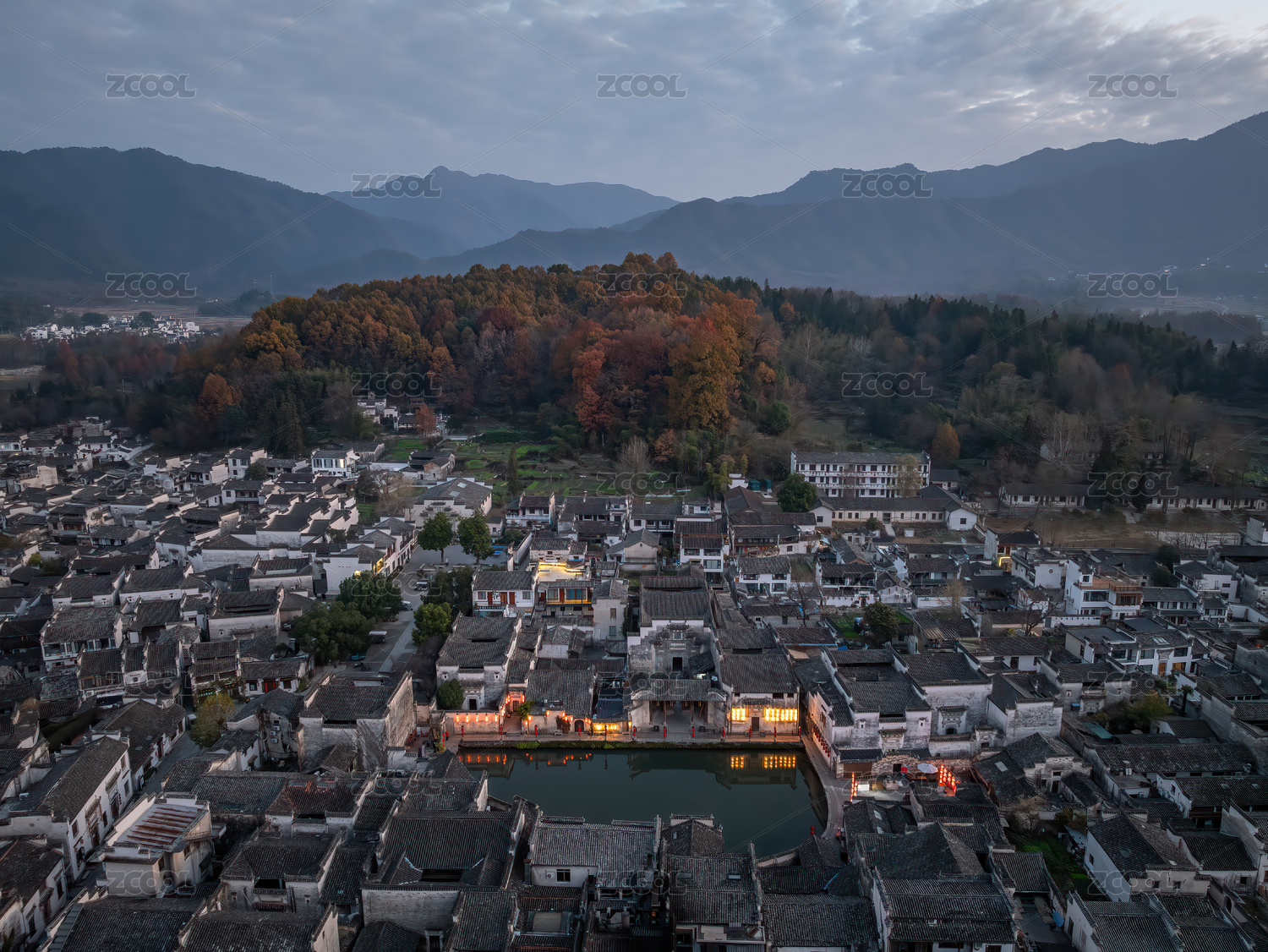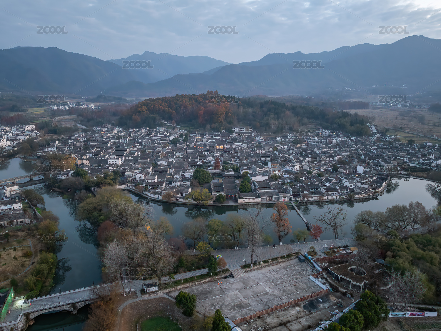 安徽黄山水墨江南宏村徽派建筑群秋色航拍