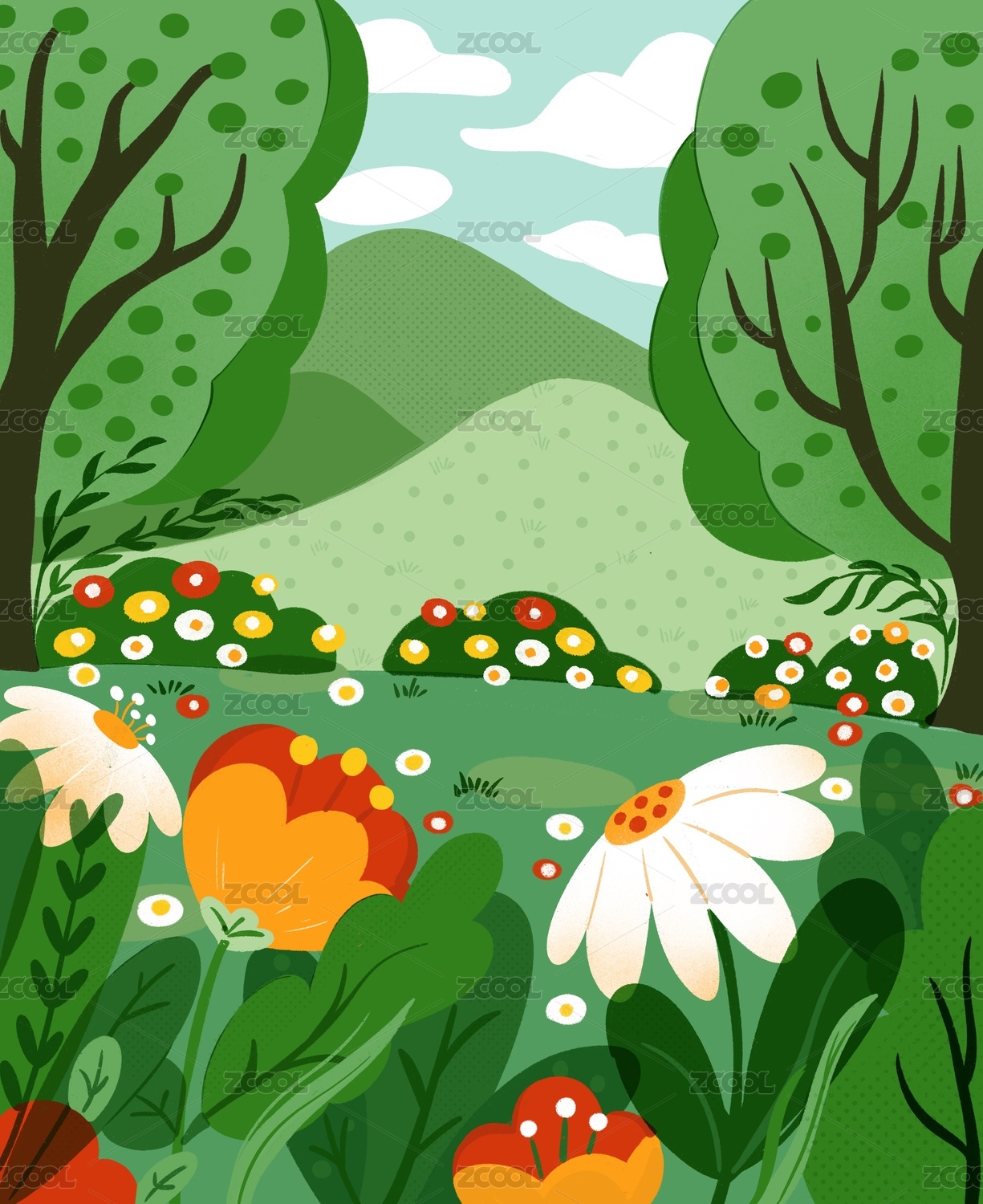 春天户外森林花海清新手绘绿色风景插画