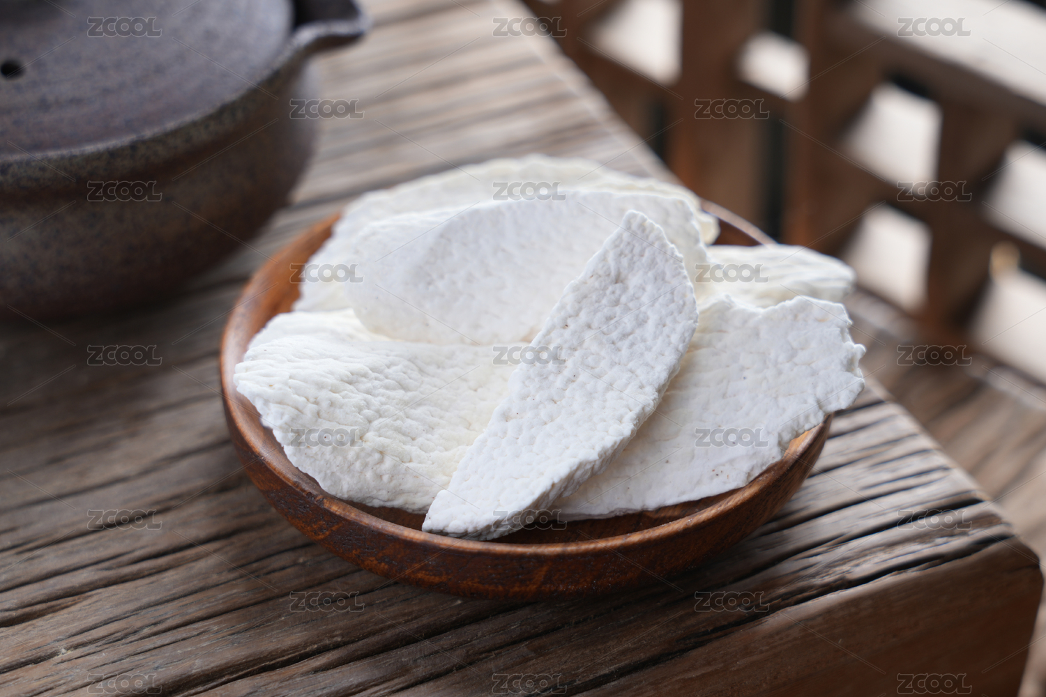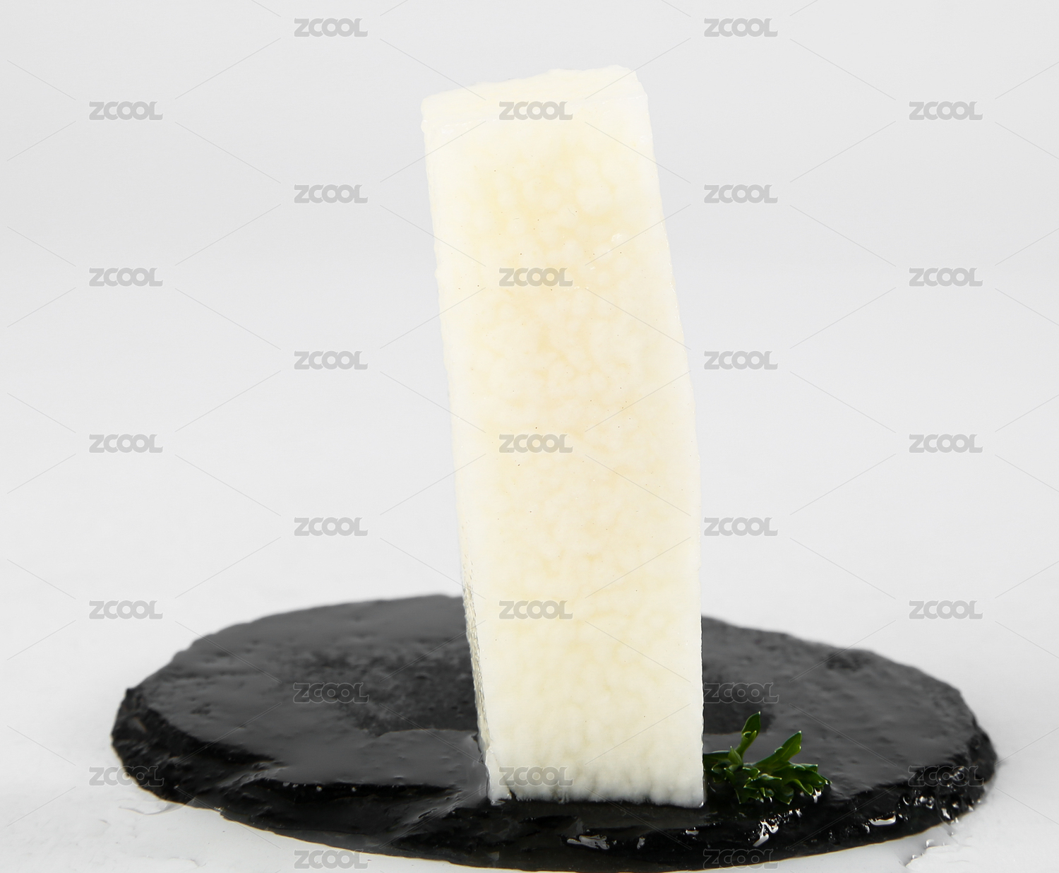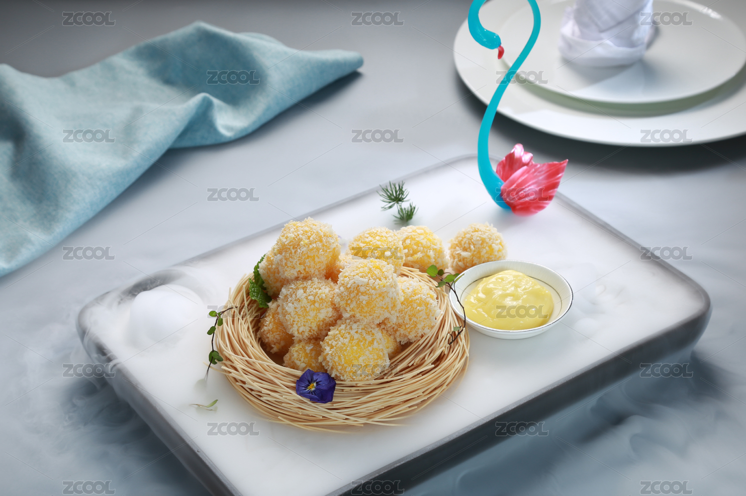 黑色长瓷盘上冒着干冰烟雾的淮山药雪花球