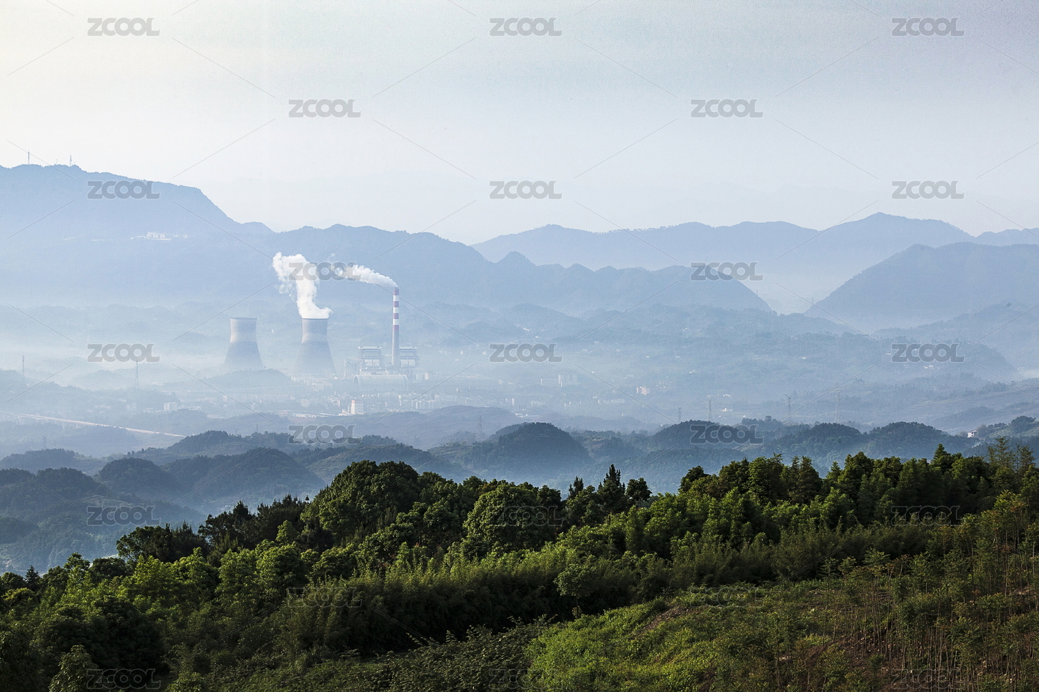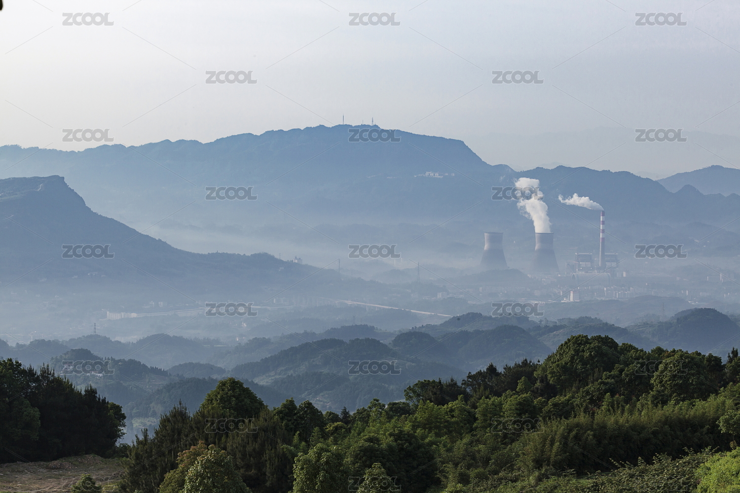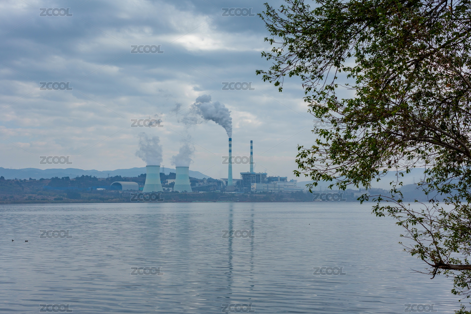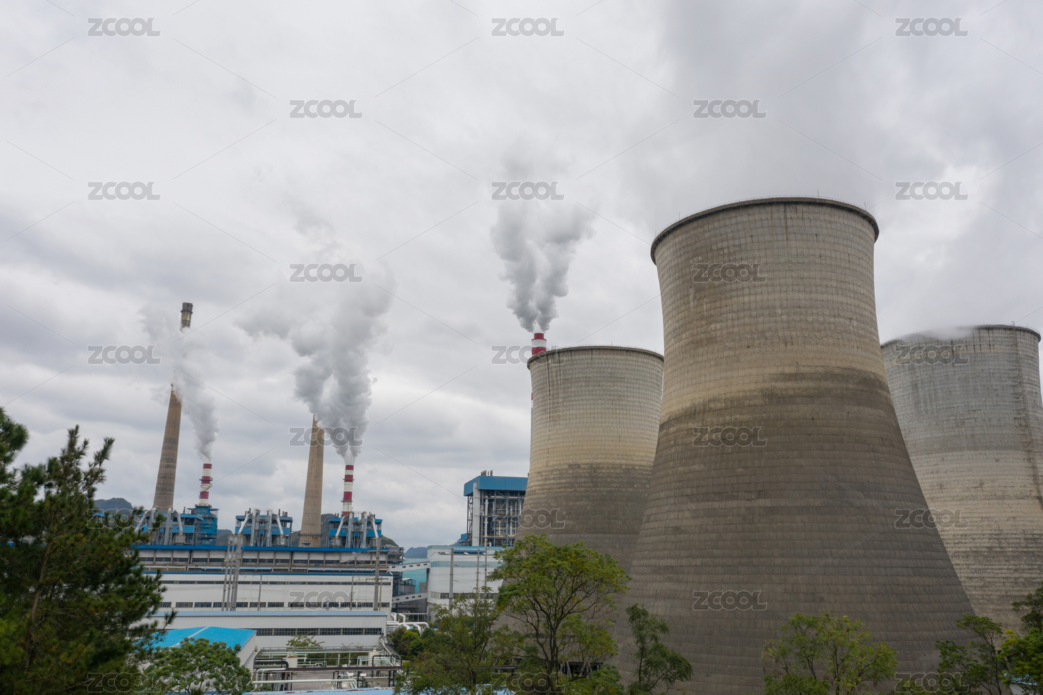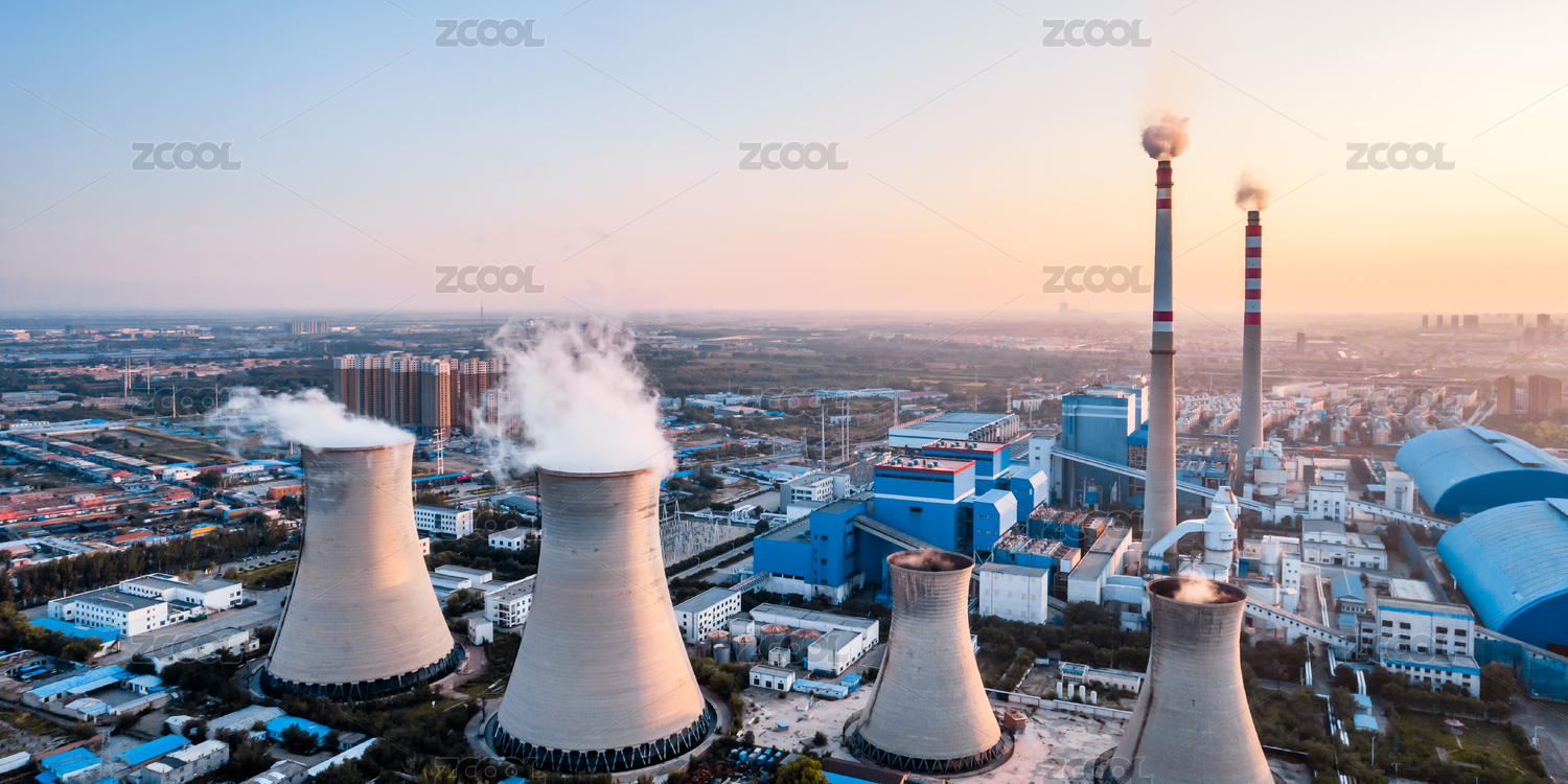 正在作业的火电厂大烟囱冒烟景观
