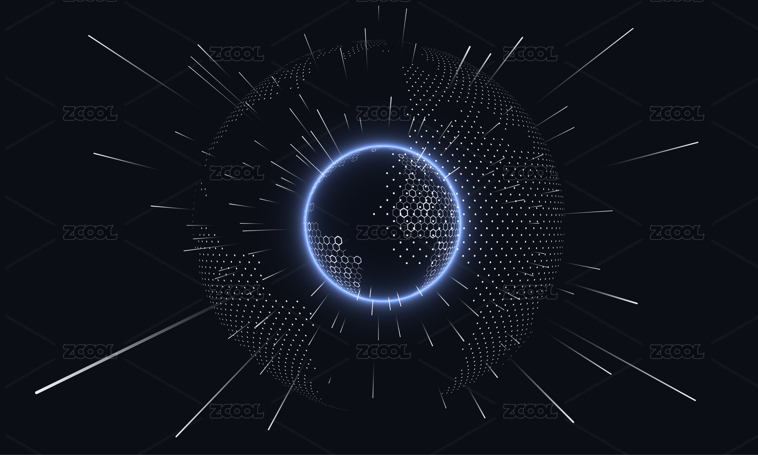 未来科技感的地球,代表高科技、大数据和物联网,点阵的球体和六边形网格地球