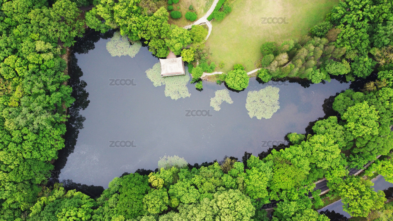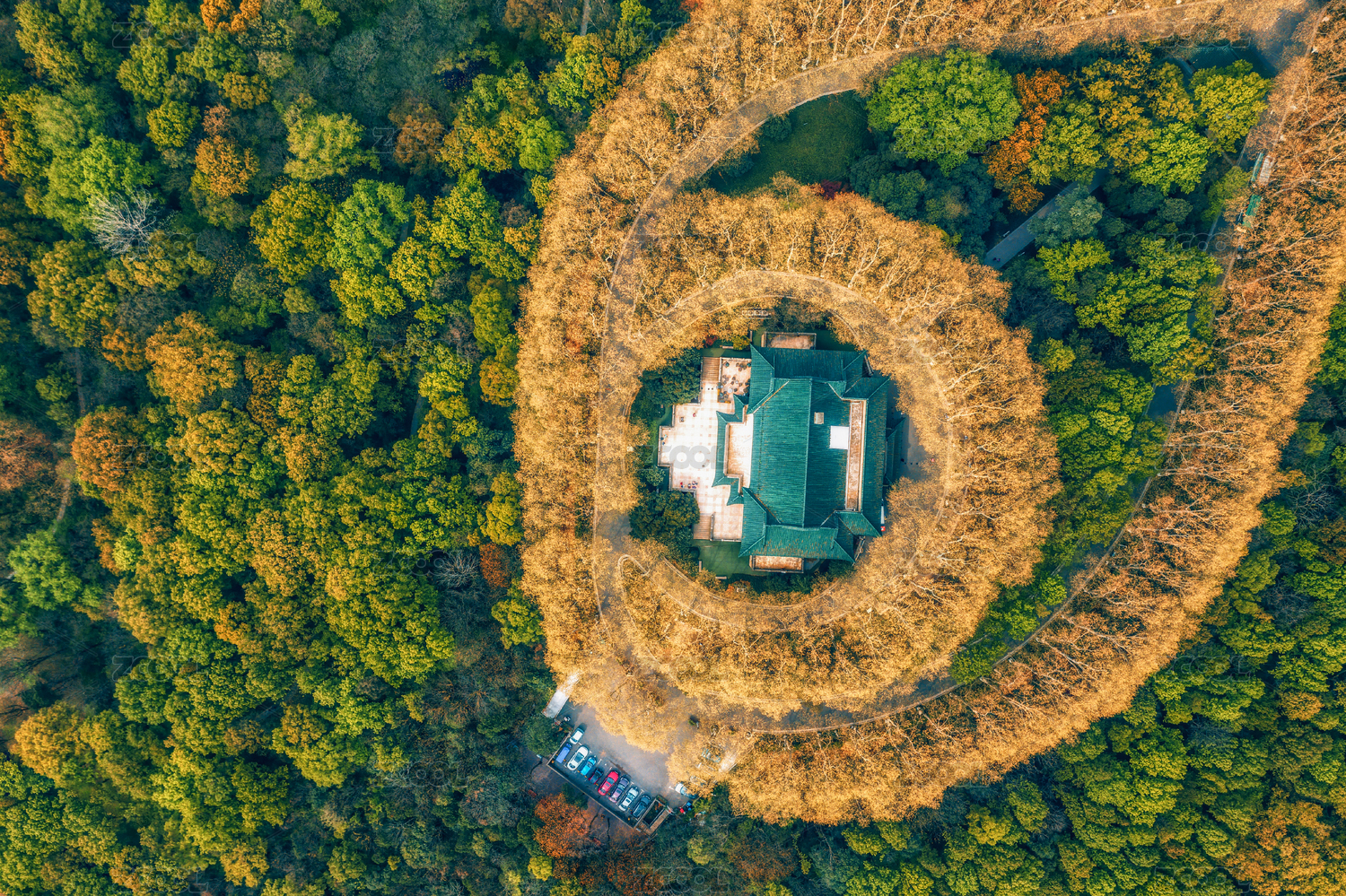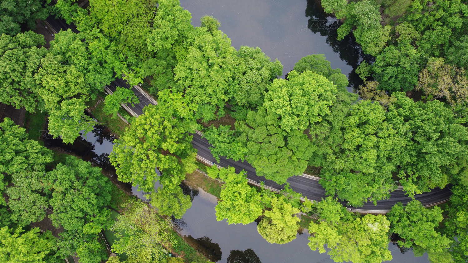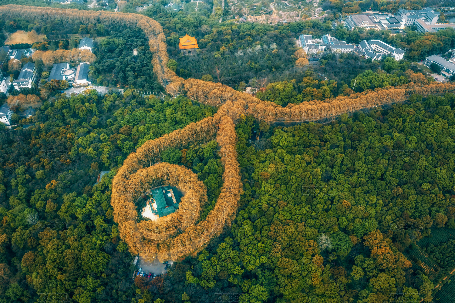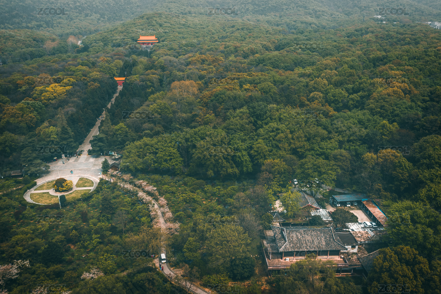 春夏南京钟山风景区的水榭路航拍