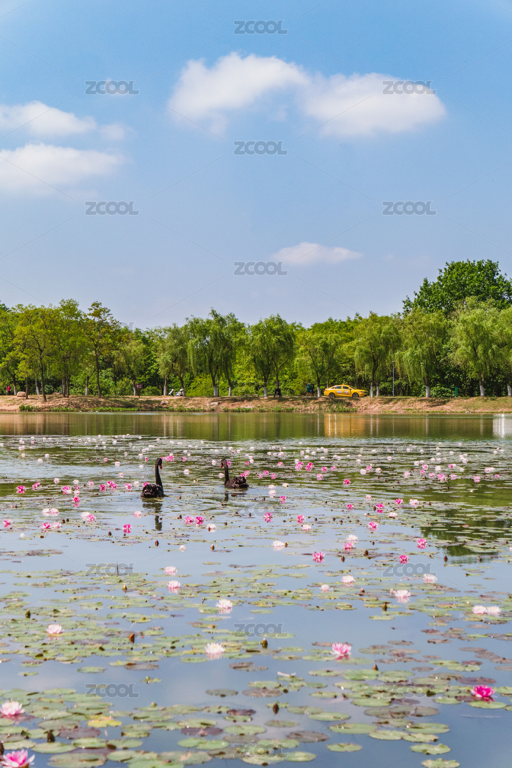 南京钟山风景区湖中两只黑天鹅游荡