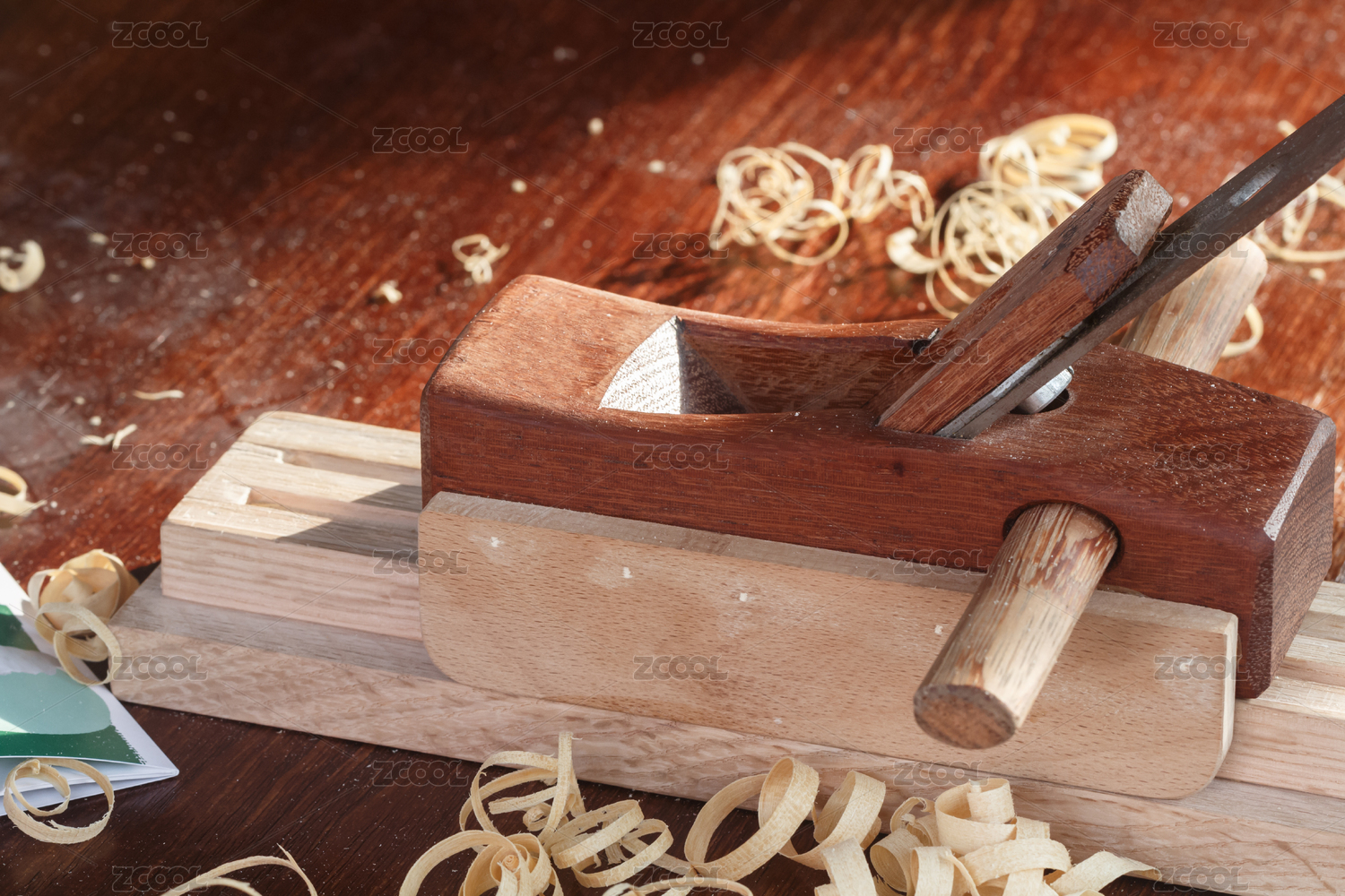 摆放在桌面上的由硬木制作的木工刨子