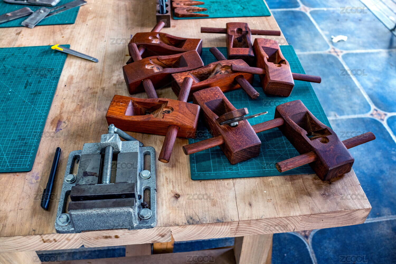 木工刨子和刻刀放在桌子上