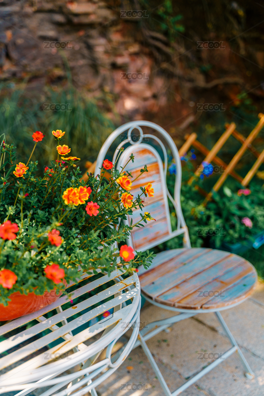 花园里的摆放的桌椅和鲜花