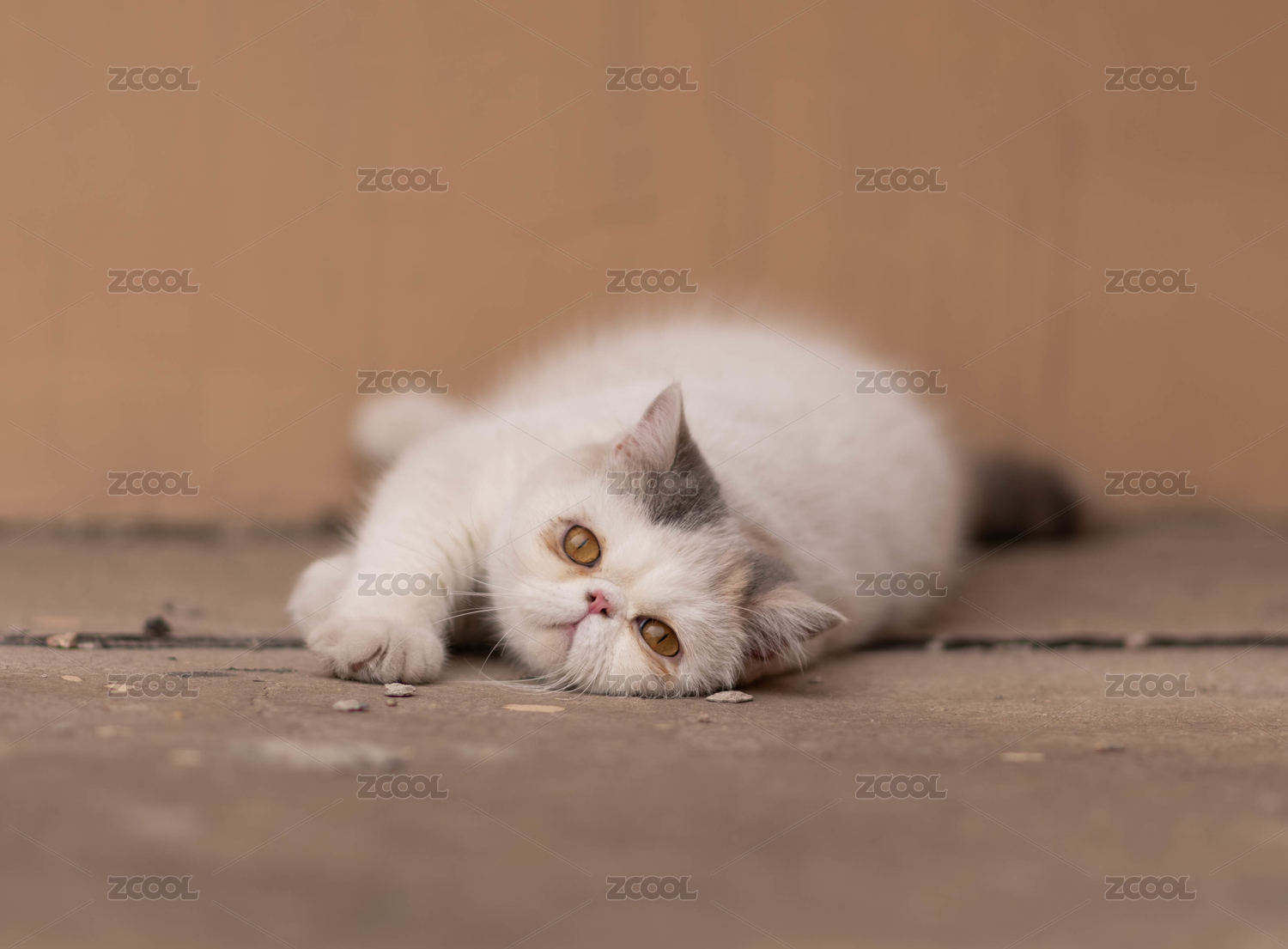 一只懒洋洋的白色三花加菲猫正在躺在水泥地上打滚儿