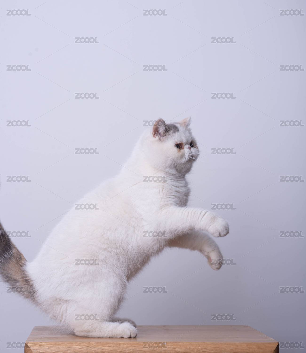 一只小加菲猫站在柜子上两只小爪子准备捉玩
