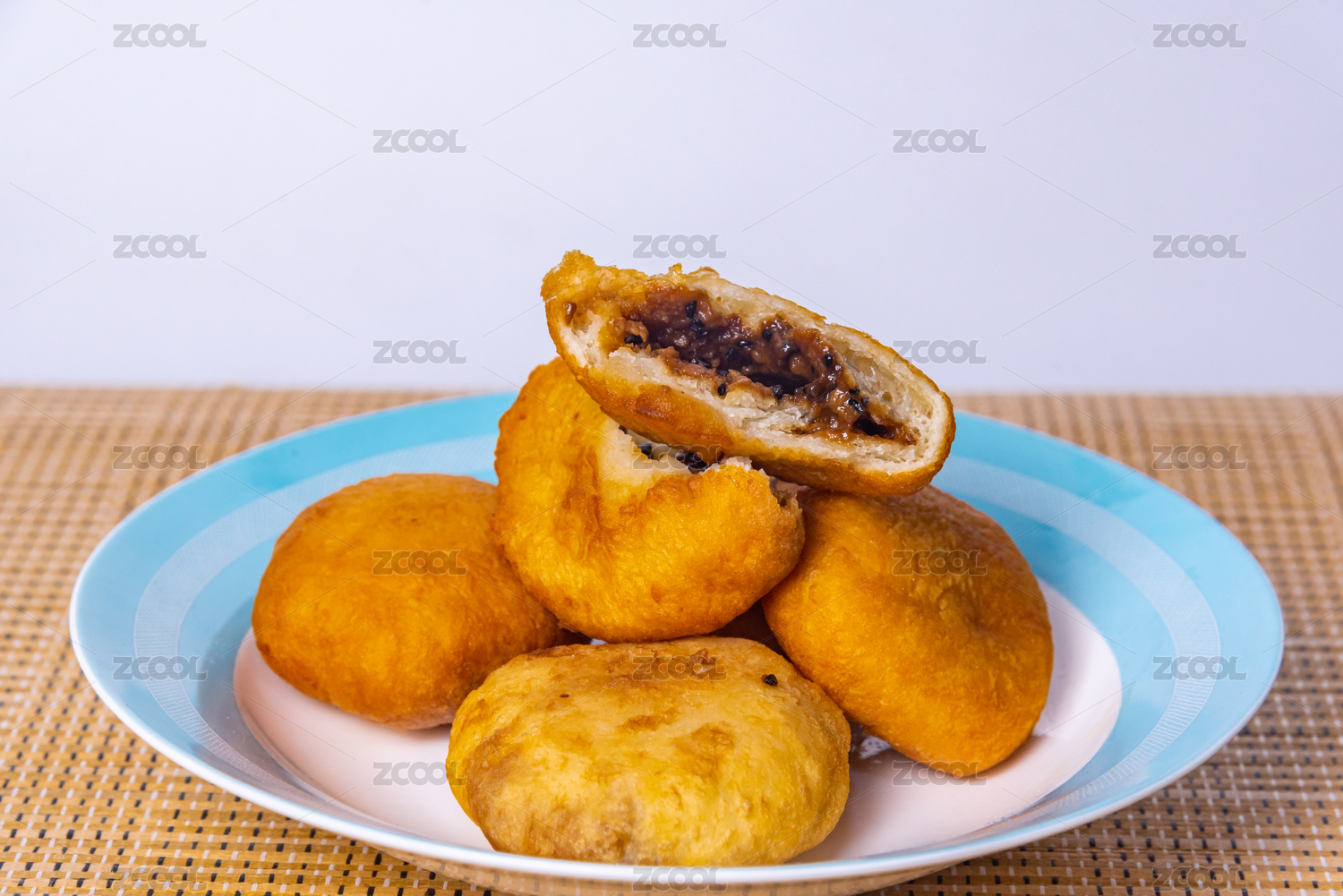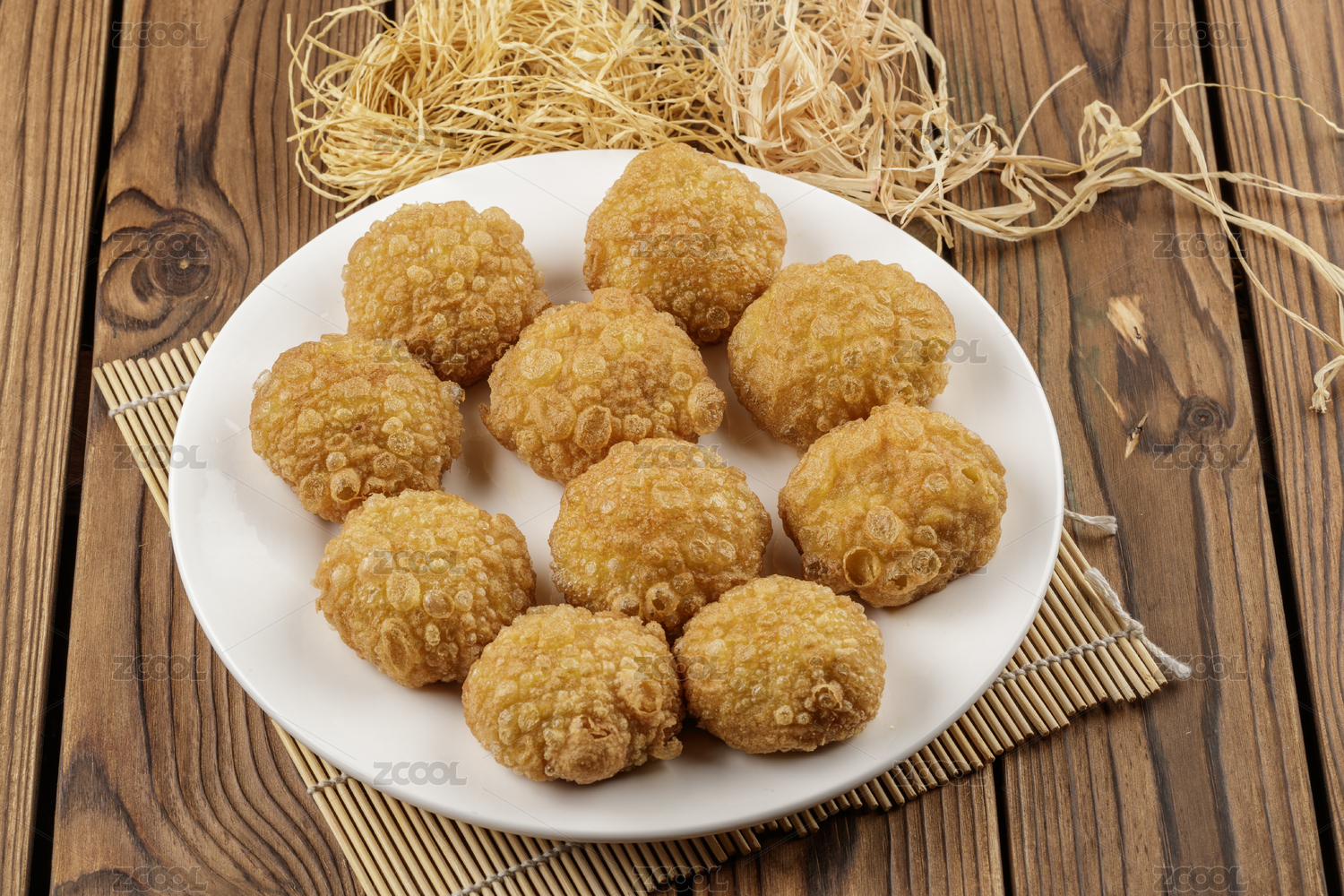 圆形白色瓷盘装的油炸糕摆放在寿司帘上