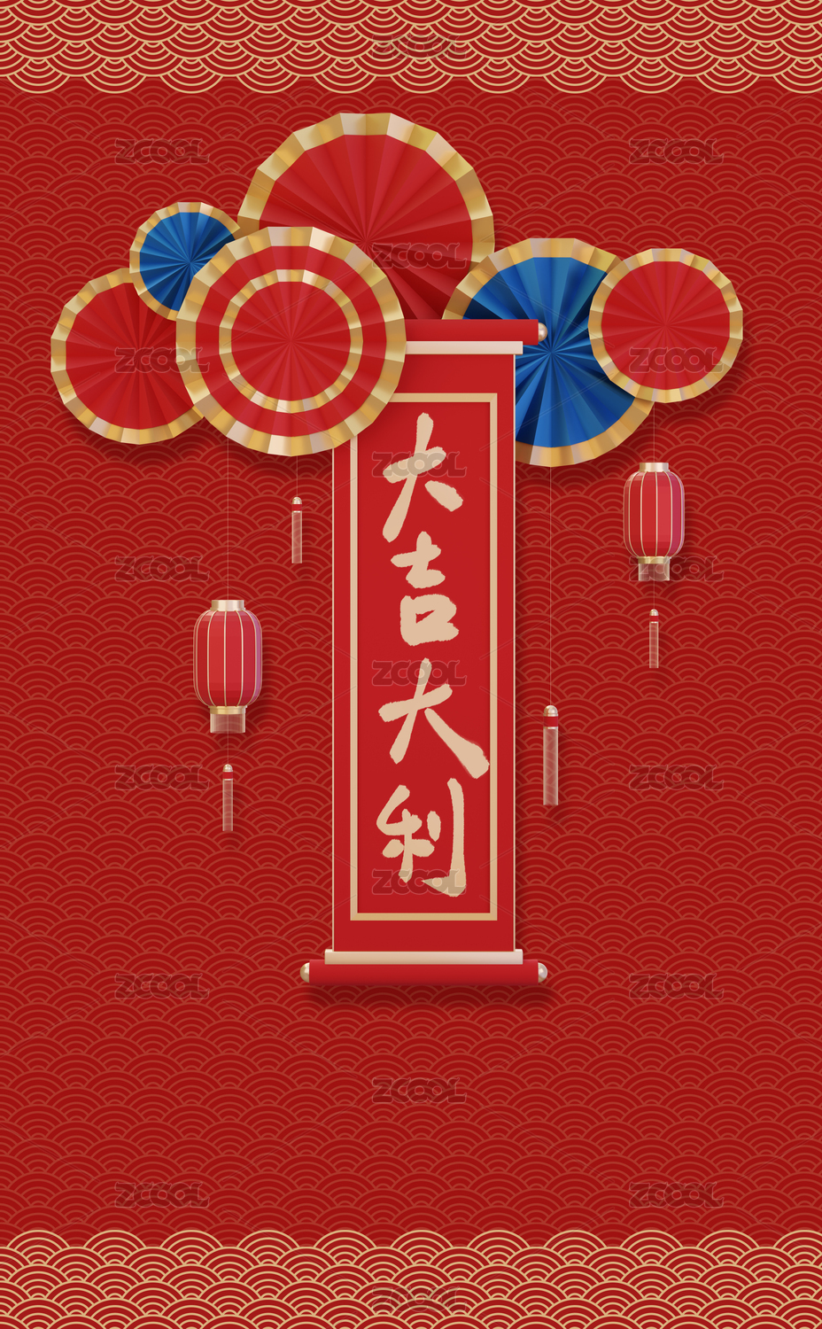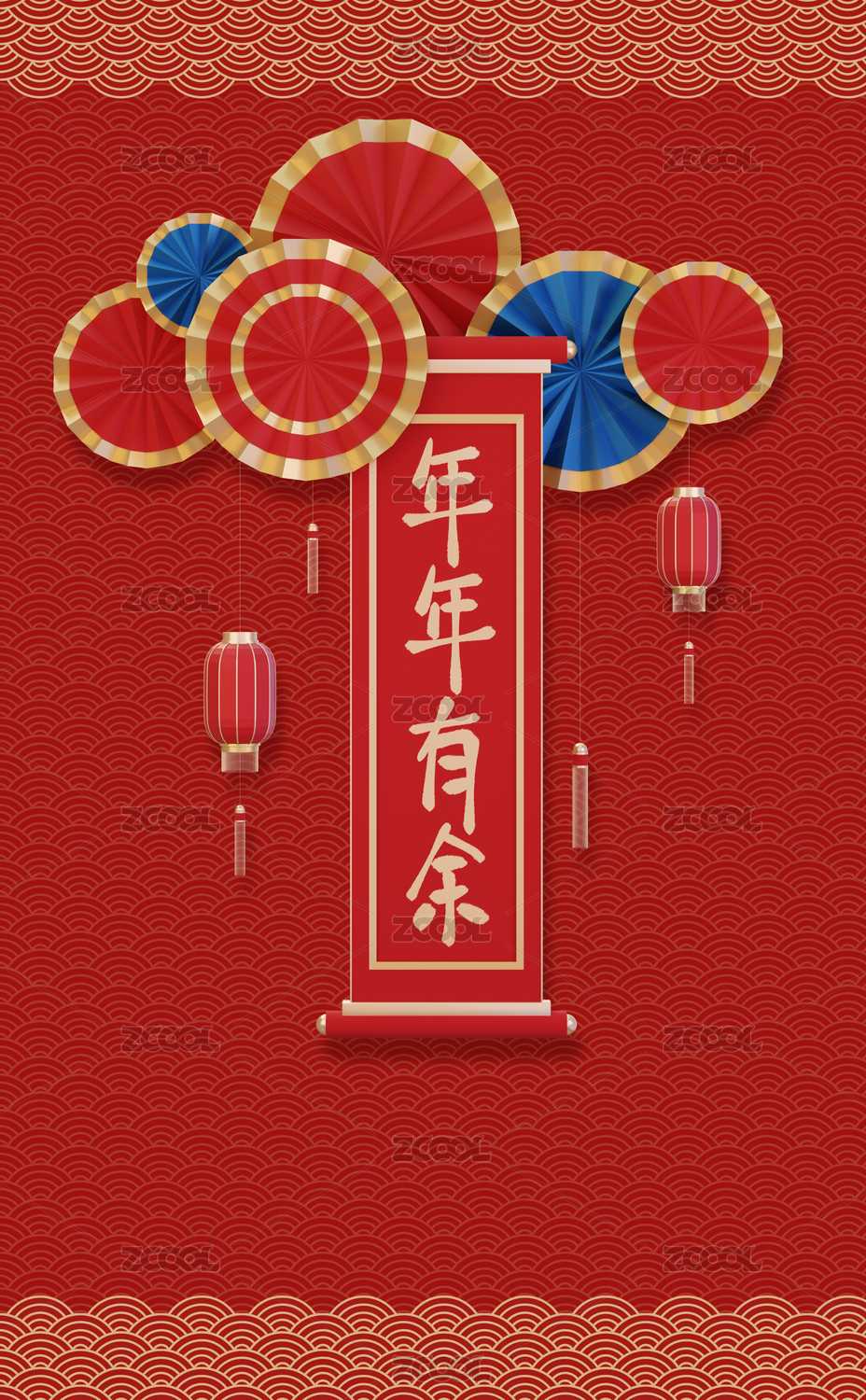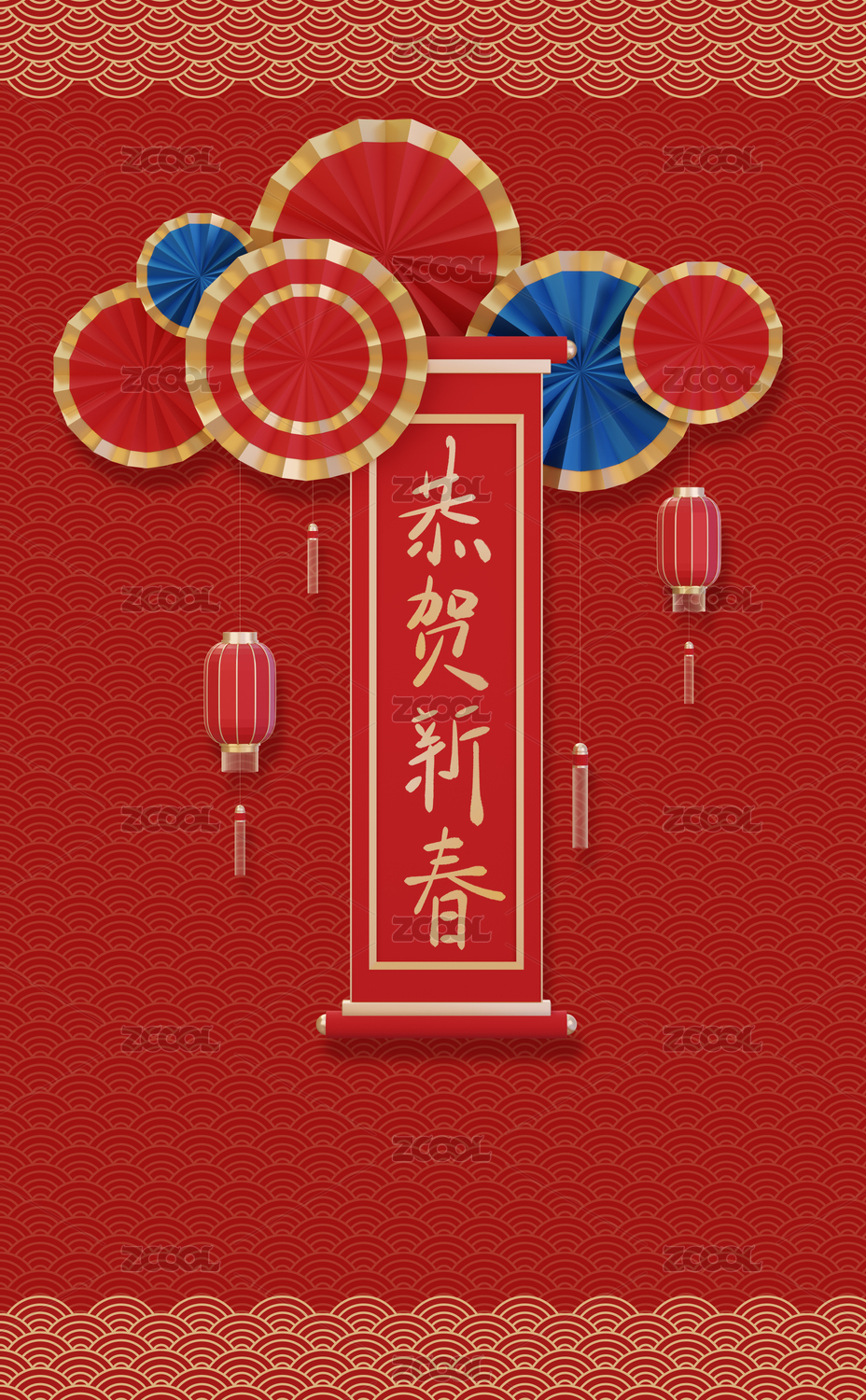 竖版喜庆新年国潮手写书法拜年祝福春联插画