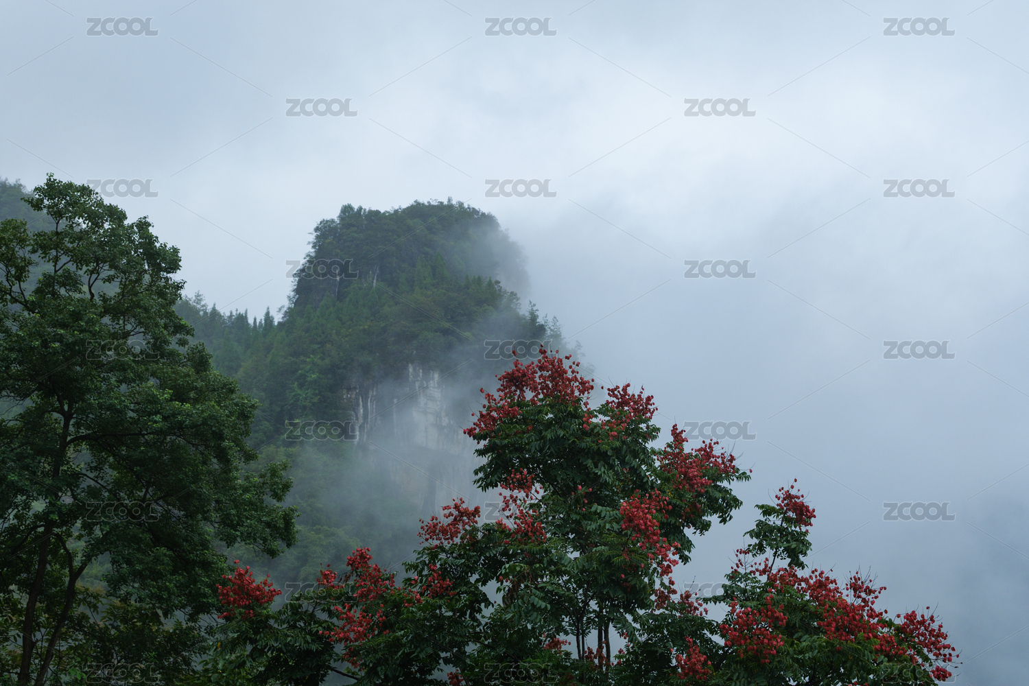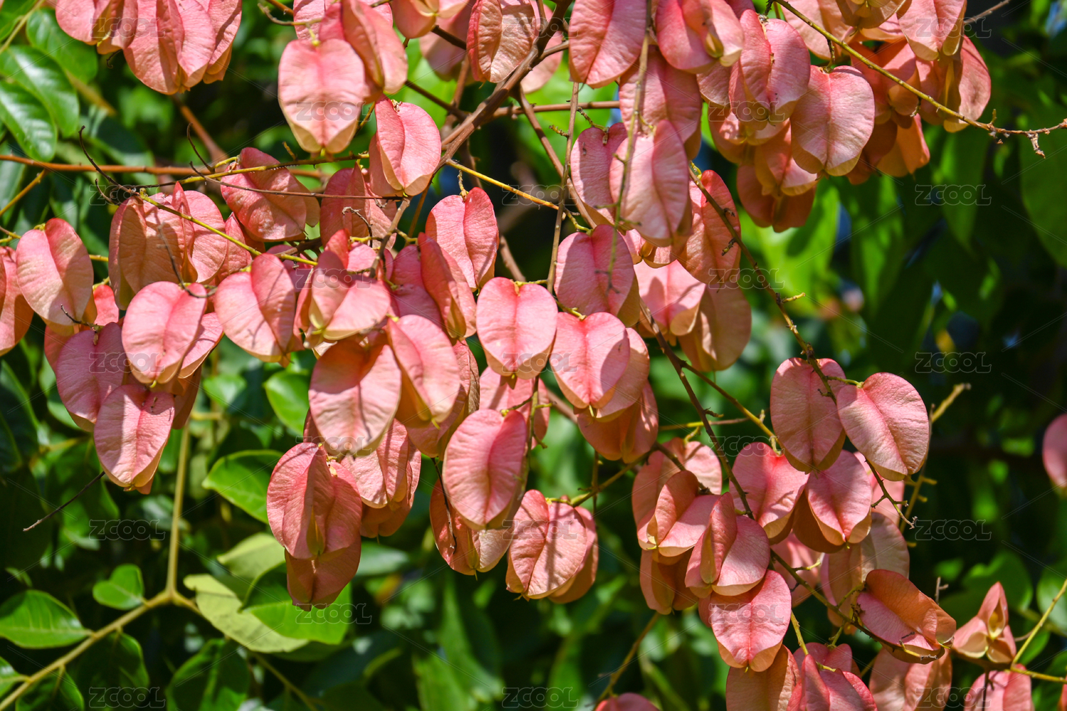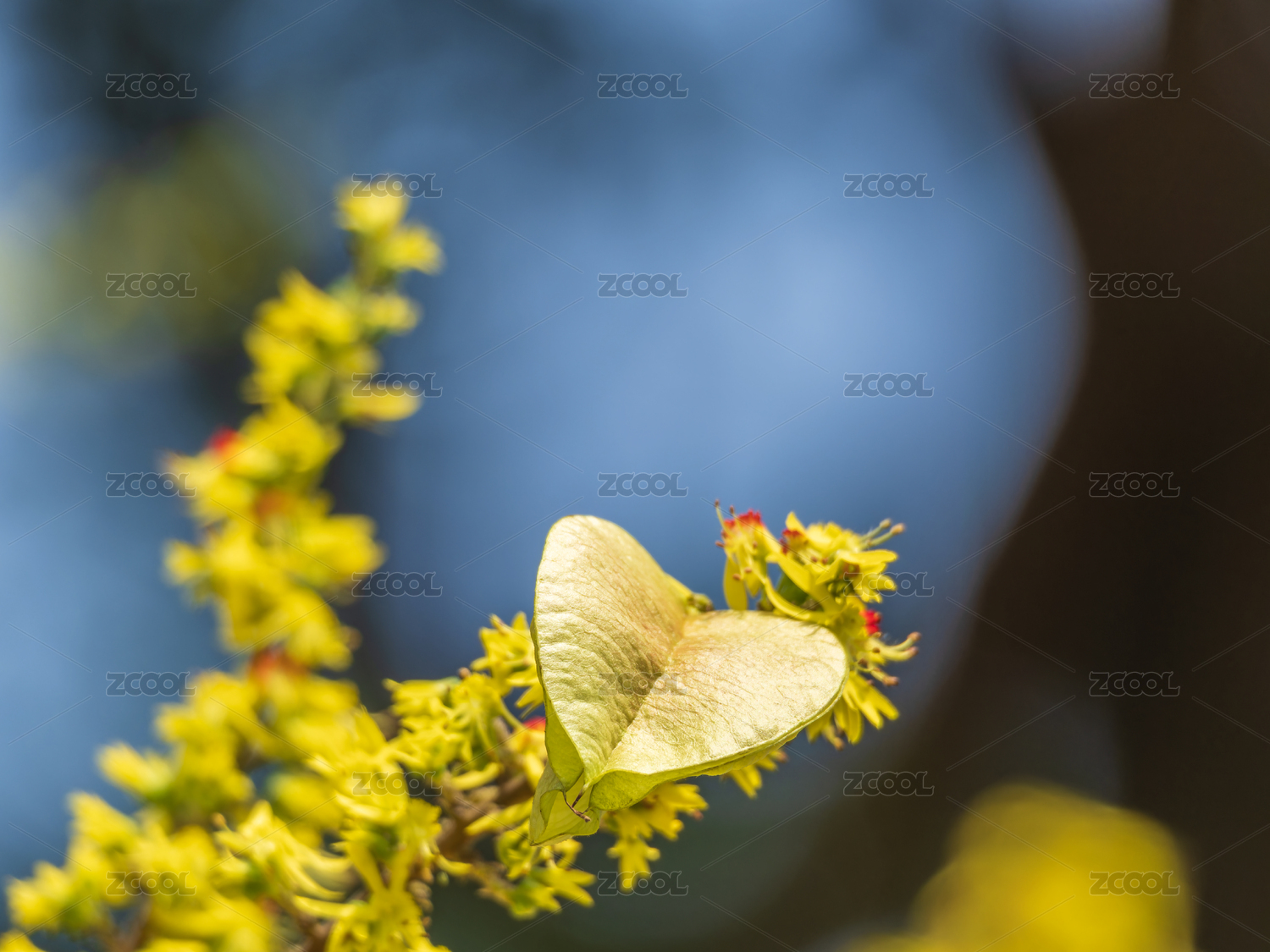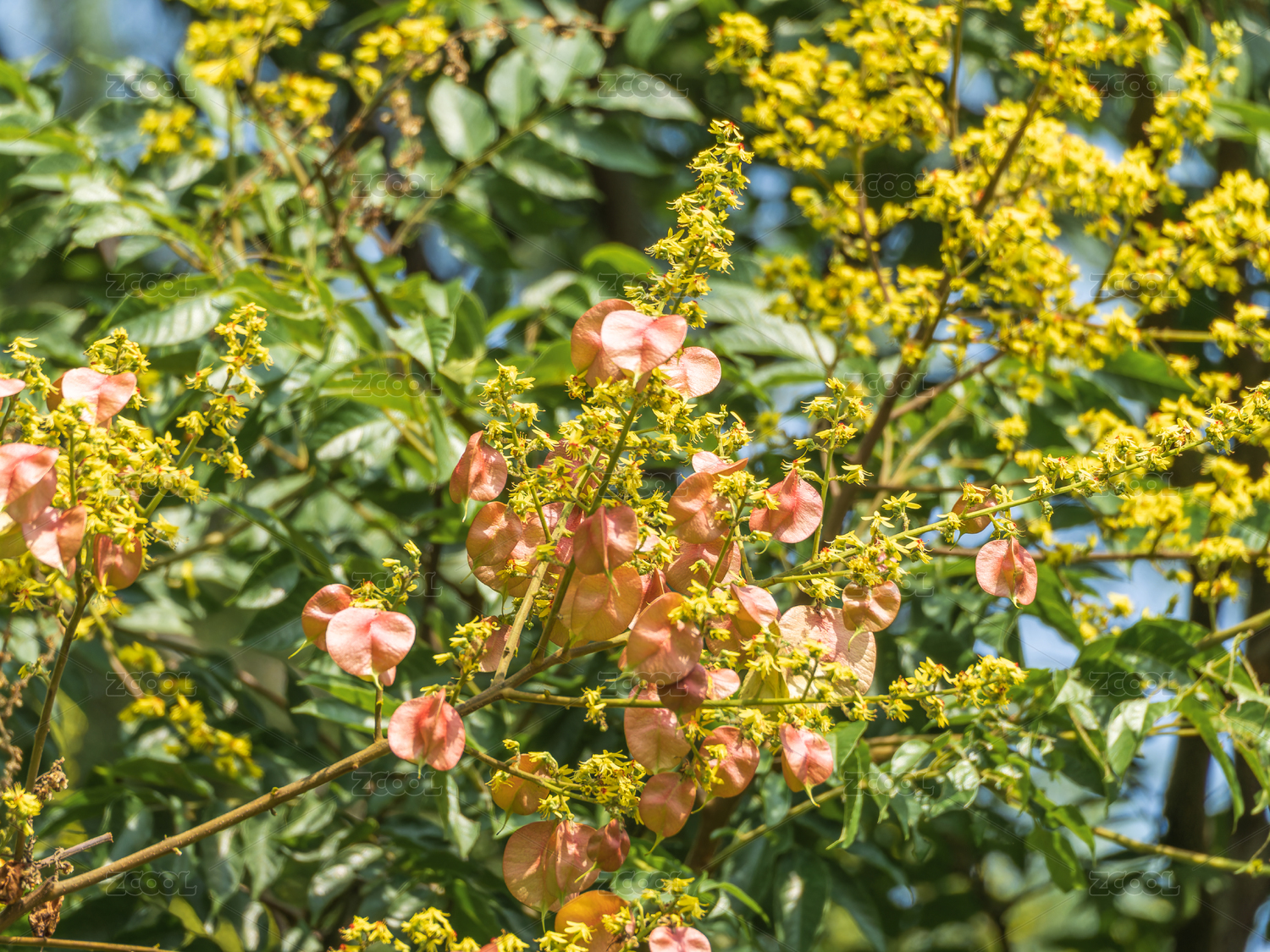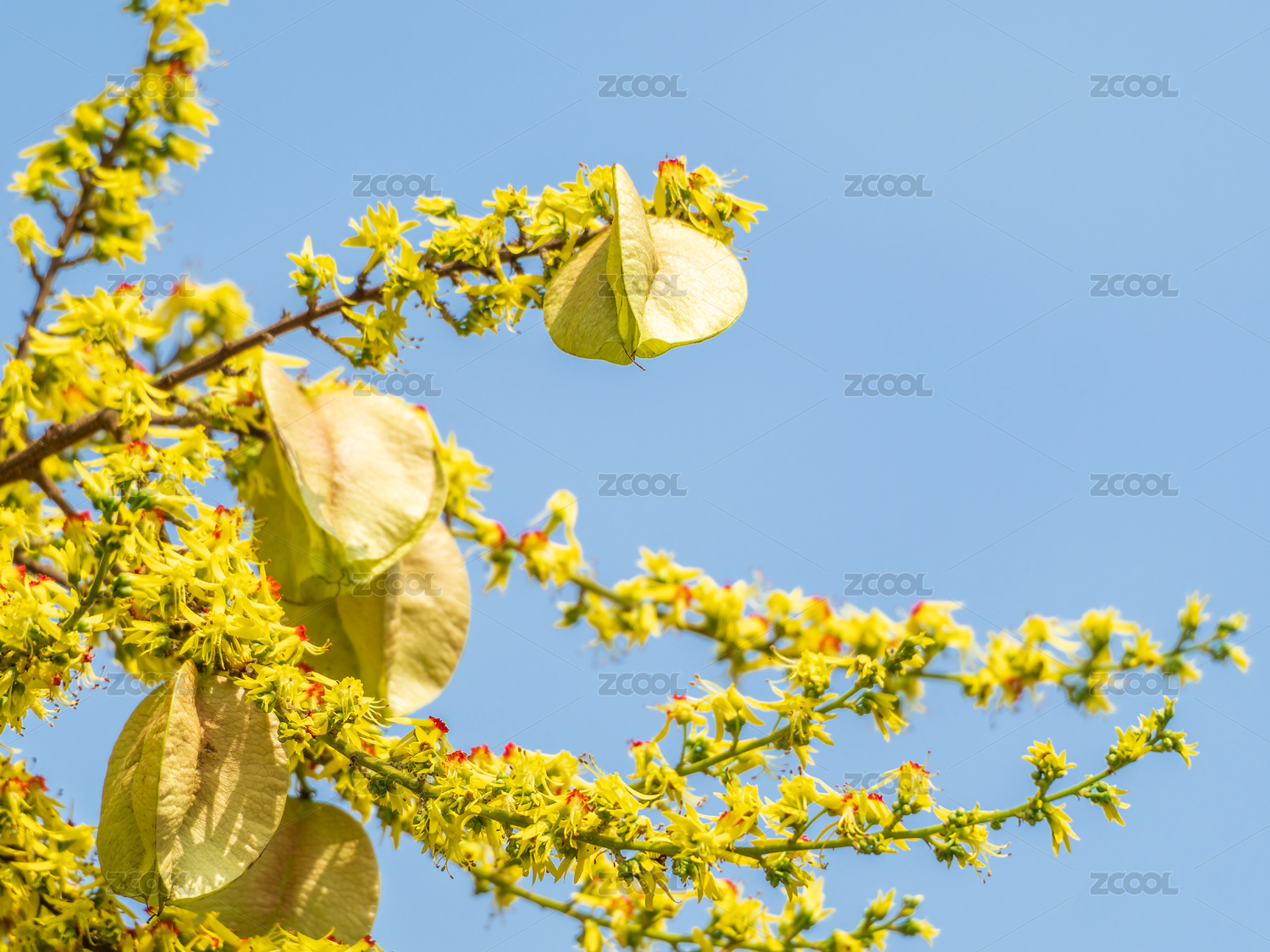 秋日蓝天下,栾树的红色蒴果在阳光中闪耀