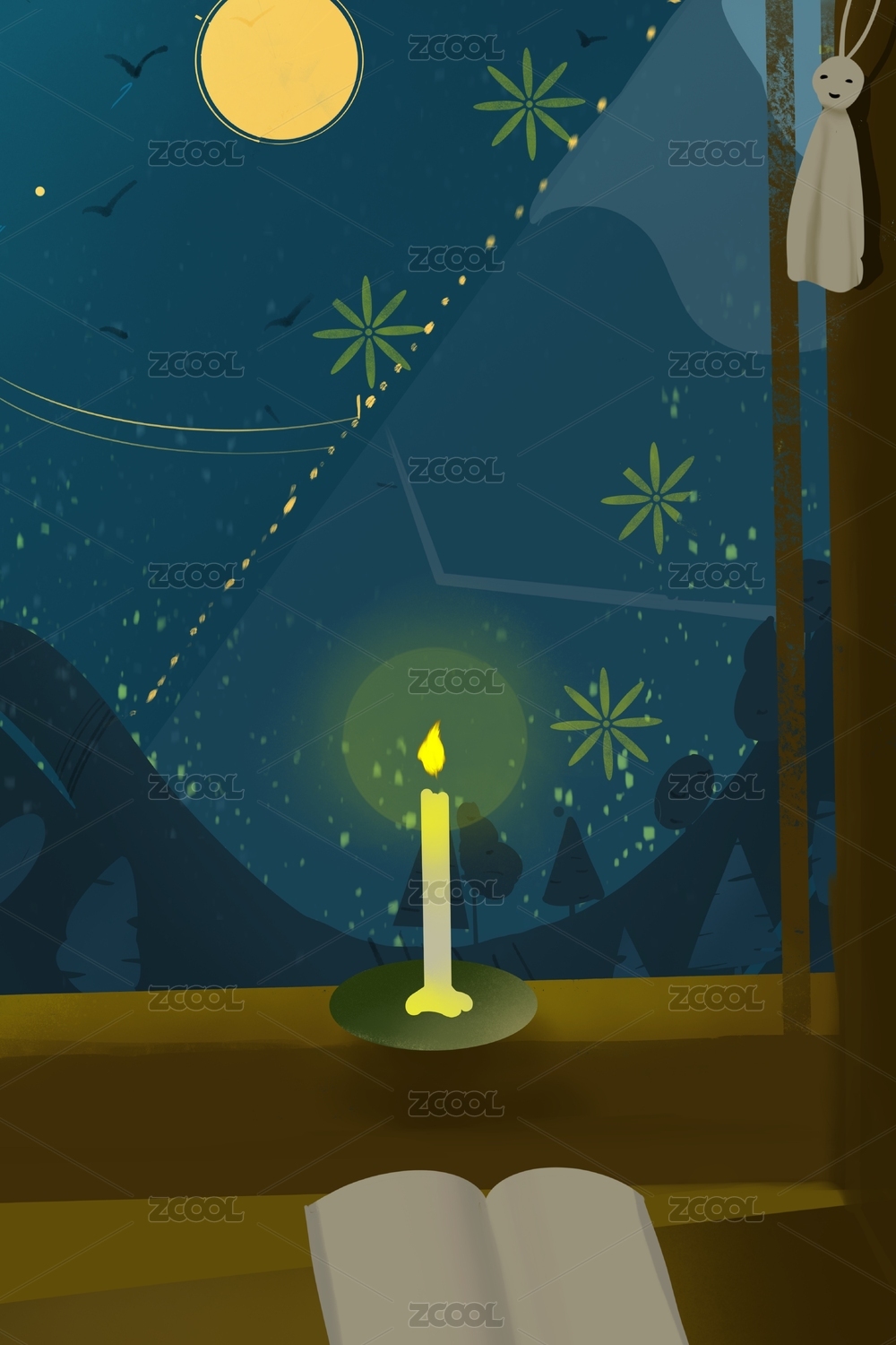 在夜晚星空下窗前蜡烛照亮着正在阅读的书籍