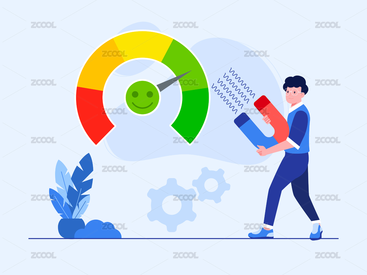 一个男生手拿吸铁石吸仪表盘矢量扁平插画