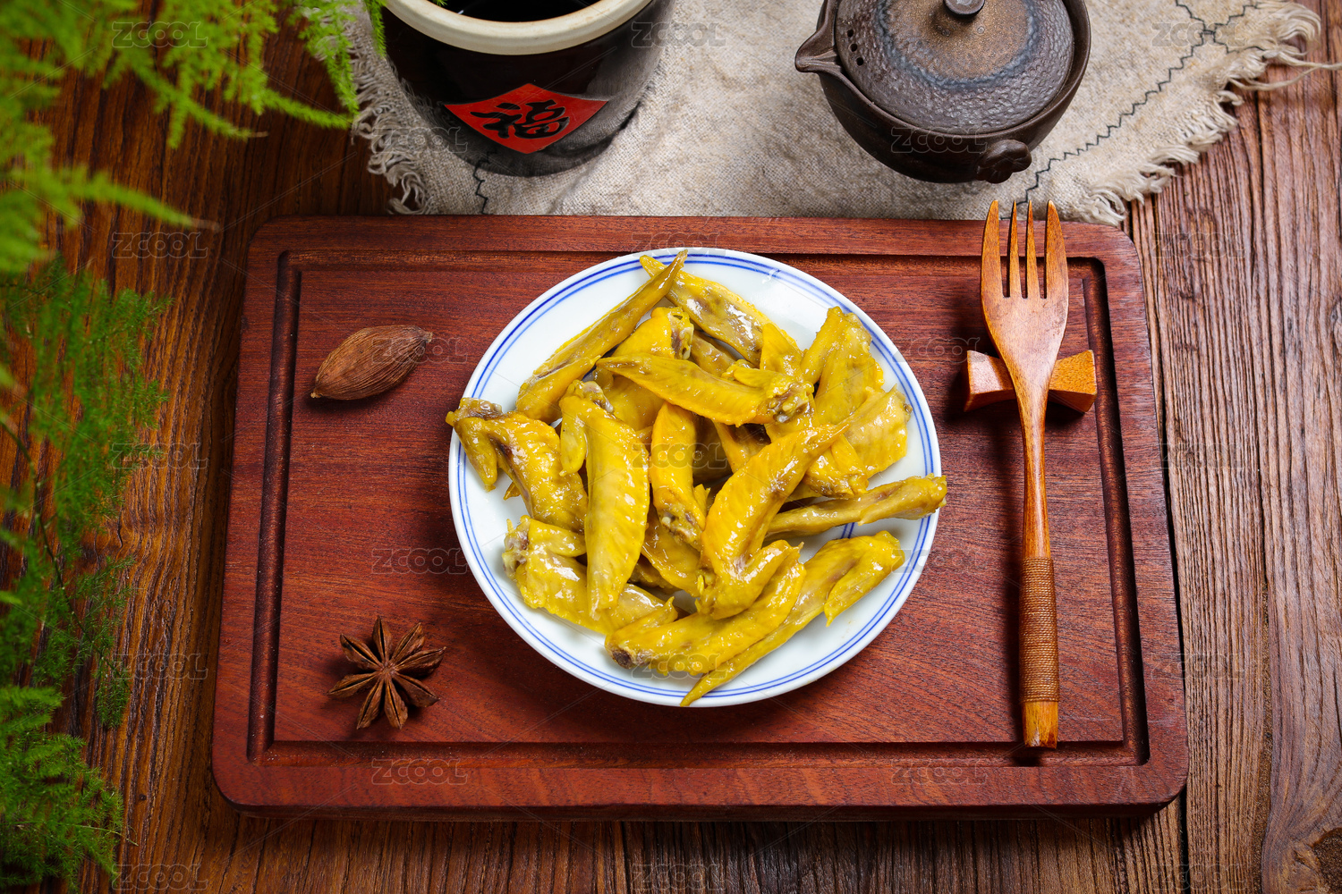 桌面上的盘子里的美味可口的盐焗鸡翅尖