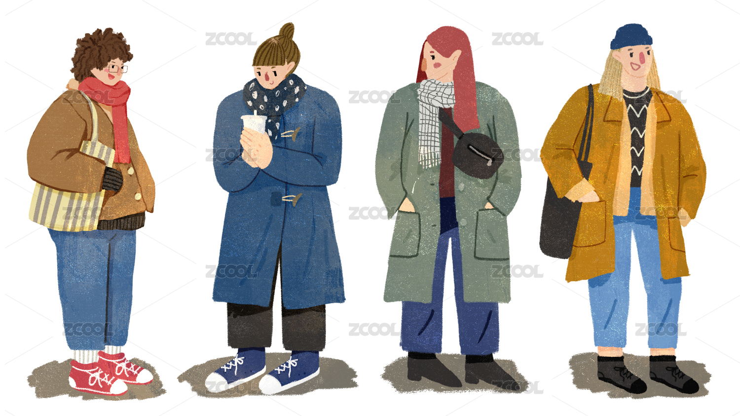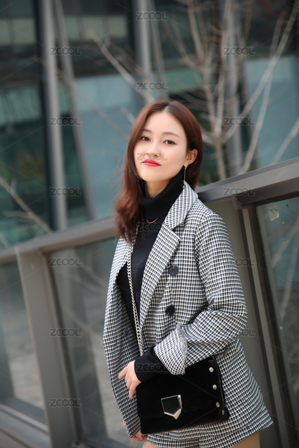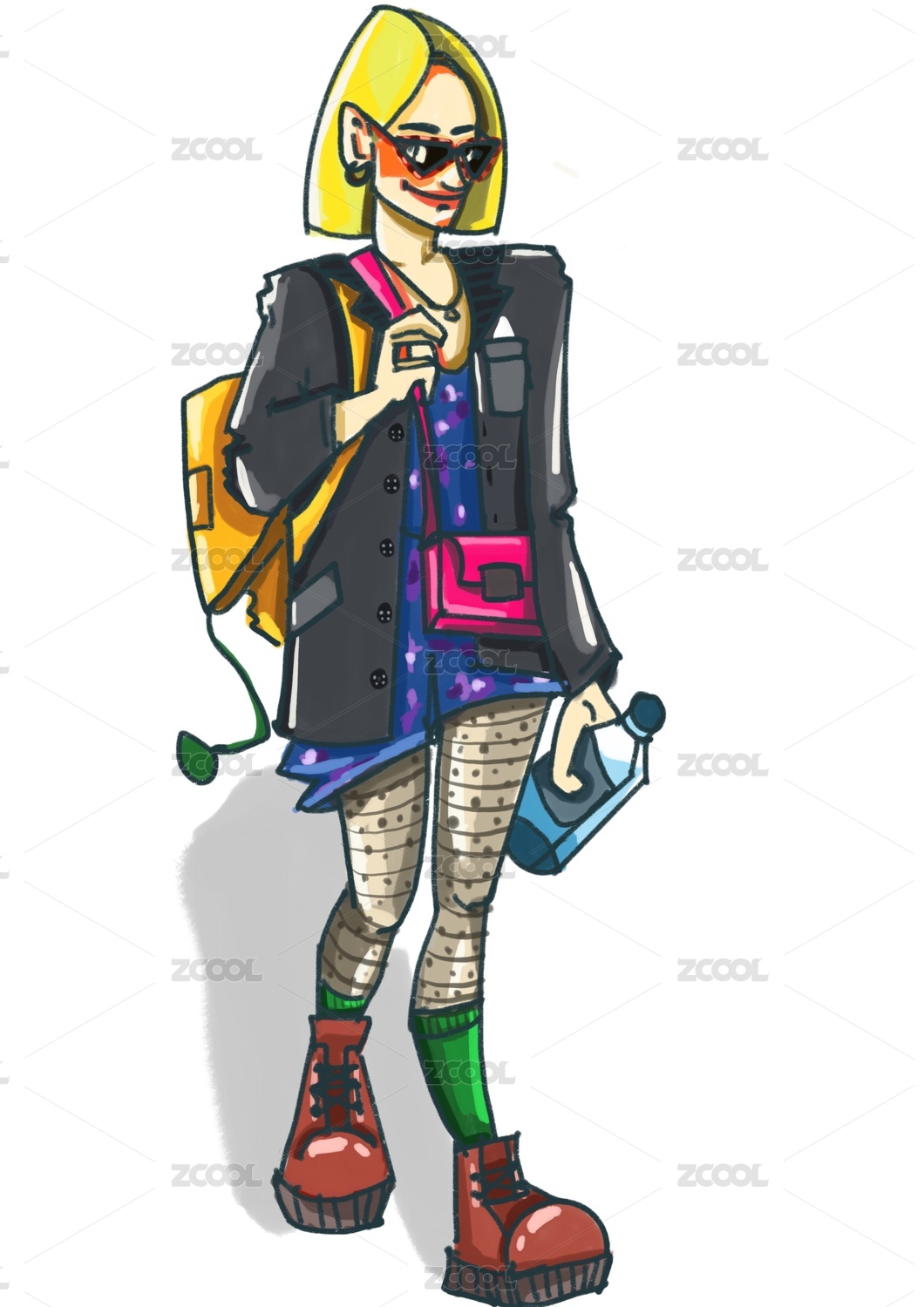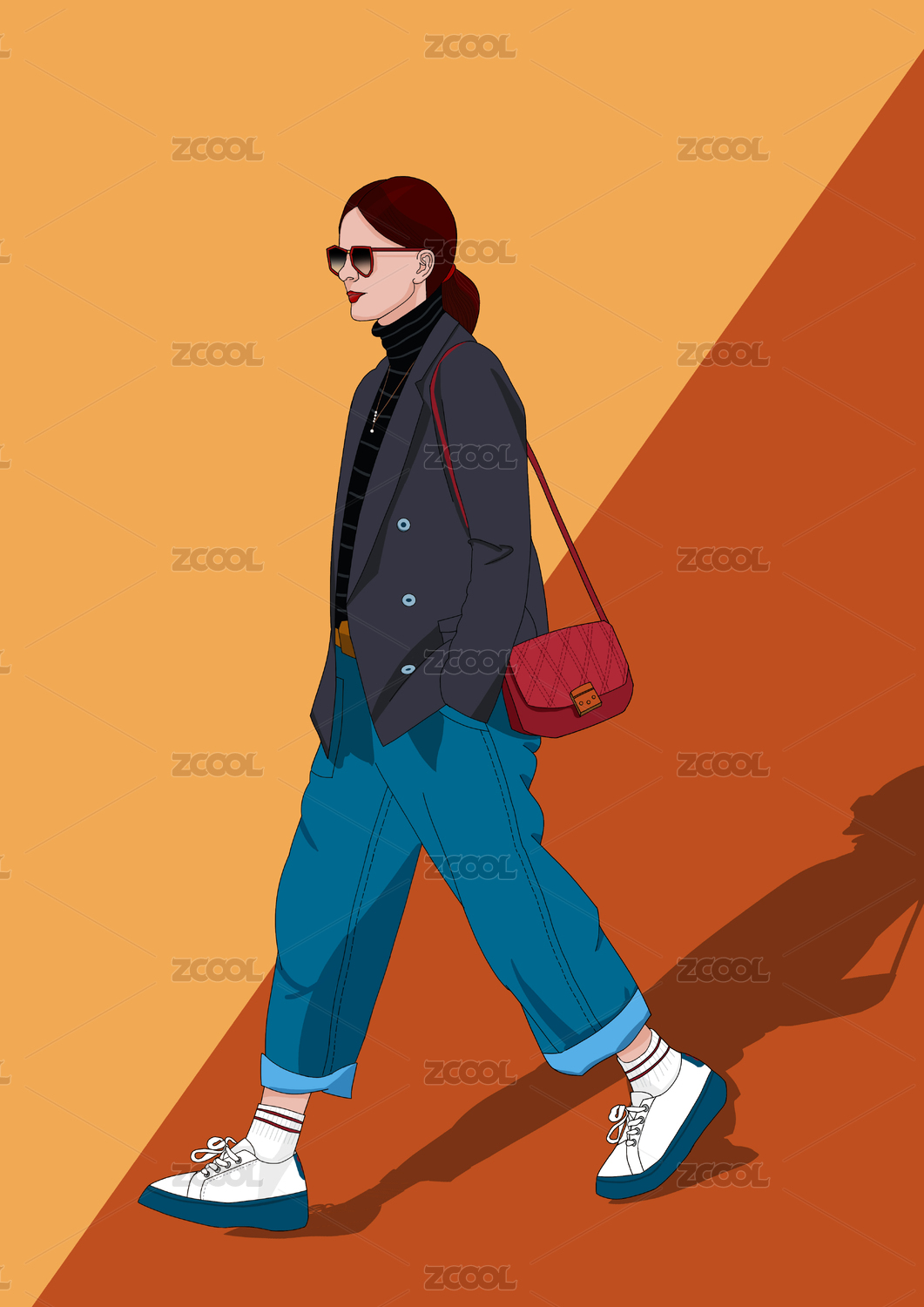 女孩穿着时髦的衣服在城市的街边拍照插画