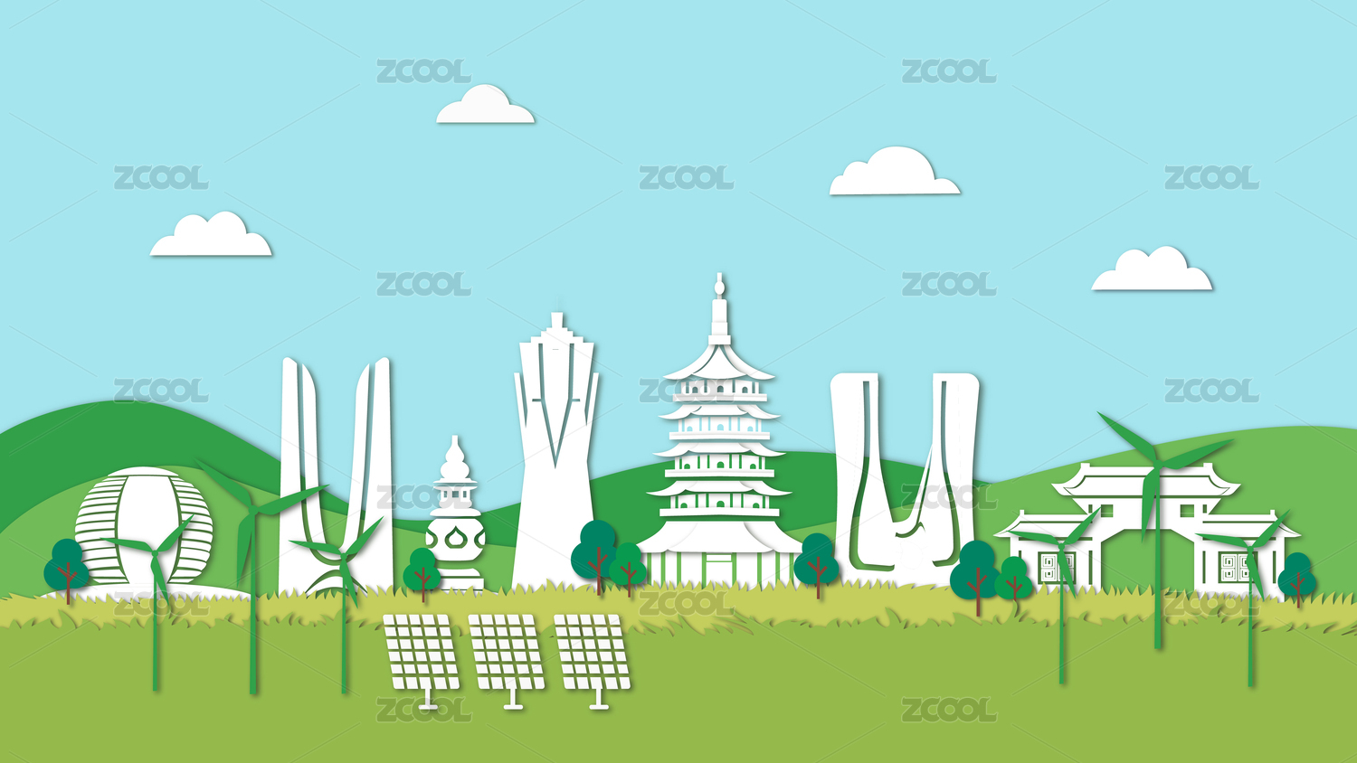 成都新能源绿色城市剪纸风插画